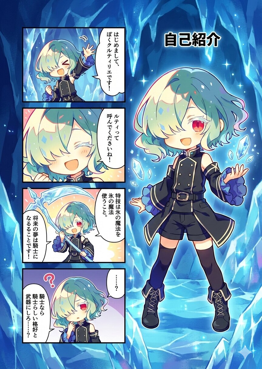 全ては創作者俺の趣味です 将来的には氷魔法による止血や足止め、ガードができるようになる予定 つまるところ味方のサポートができる聖騎士ですね!!!!! そして敵に被害を受ける前に倒してしまうことは実質味方への護りでもあるので大鎌は必要。(そうかな……)
