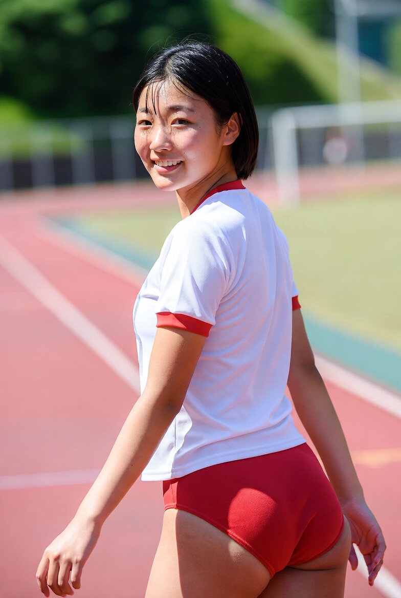 日本の女子高生18歳、エンジ色のブルマを履いている。白い体操着をきている、袖口はエンジ色になっている。校庭の陸上競技用トラックでスタートの準備をしている、練習に向かう新鮮な表情とポーズ。斜め後ろ姿、短い黒髪。自信に満ちた笑顔の表情、夏の屋外光、リアルフォト、詳細な肌の質感、photorealistic, masterpiece, best quality, natural lighting, shallow depth of field, 清楚でたくましい雰囲気。
