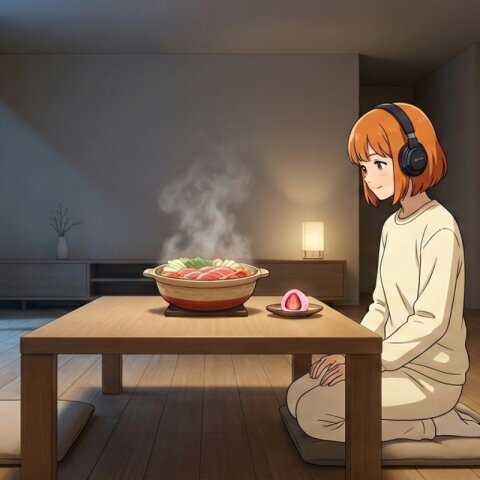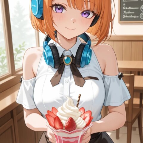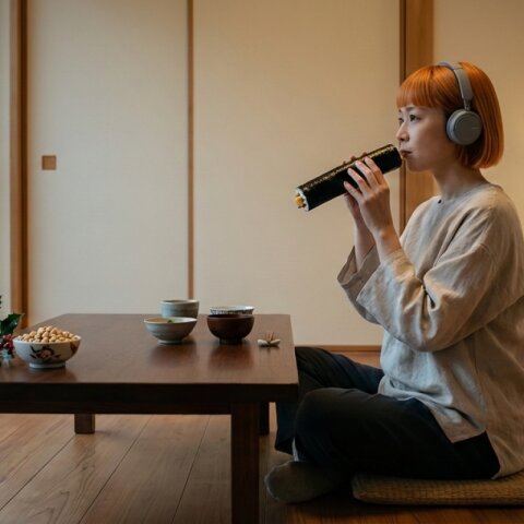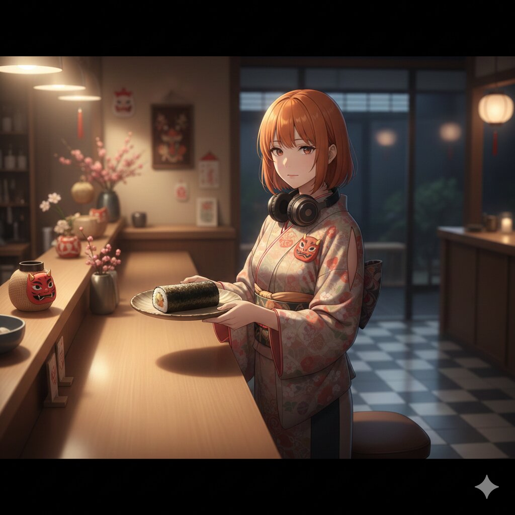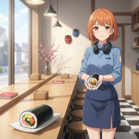 Half-body composition, cinematic, ultra-detailed, dignified nighttime café atmosphere. Inside Zena’s AIcafe at night, a refined Japanese-modern café softly illuminated by warm, gentle lighting. The interior features a clean ichimatsu-patterned floor, minimalist wooden counter seating, and a carefully composed space; no tatami is used. The café feels quiet, still, and contemplative, wrapped in the calm of evening. Subtle Setsubun decorations are arranged throughout the café — small oni motifs, red-and-white accents, seasonal ornaments, and understated festive elements that add warmth and meaning without disrupting the serene atmosphere. On the café counter rests a whole, uncut ehomaki, placed neatly on a simple ceramic plate. The presentation is restrained and respectful, emphasizing form, balance, and tradition rather than decoration. Behind the counter stands Zena, visible from the waist up, offering the plated ehomaki with both hands. Her posture is straight and poised, her movements slow and deliberate. Her expression is calm and composed, reflecting dignity, sincerity, and quiet hospitality. Zena has short orange bob-cut hair, with her signature headphones resting gently around her neck. She wears a spring-toned café uniform incorporating elements of traditional kimono fabric — such as woven textures, subtle patterns, or obi-inspired accents — blended seamlessly into a modern design. The uniform is modest and elegant, featuring refined shoulder slits and a neatly balanced mini skirt, harmonizing Japanese tradition with contemporary café aesthetics. Soft nighttime lighting casts gentle highlights on the ceramic plate, the glossy nori of the ehomaki, and the textures of the kimono-inspired fabric. Shadows are deep yet controlled, enhancing the feeling of stillness, reverence, and quiet strength. The atmosphere is dignified and tranquil — a night-time Setsubun moment defined by intention, grace, and seasonal awareness. Style: anime movie quality, soft cinematic night lighting, shallow depth of field, high clarity, refined textures, Japanese-modern café interior, emphasis on elegance, ritual, and calm stillness. Tags: Setsubun night, ehomaki, Japanese seasonal food, kimono fabric uniform, spring colors, Japanese hospitality, dignified café, ichimatsu floor, no tatami, calm night atmosphere, orange bob hair, headphones, half-body composition Negative Prompt: NSFW, sexualized content, exaggerated anatomy, playful or comedic expression, cluttered background, text overlay, watermark, blur, distortion, extra limbs