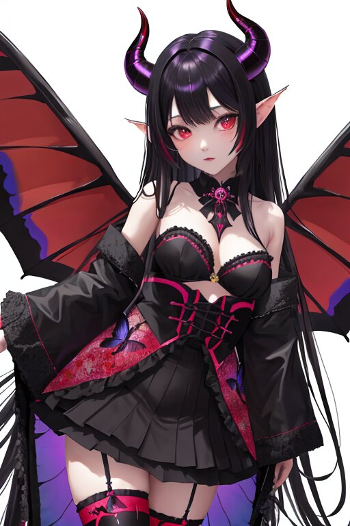 masterpiece,best quality,japanese girl,23yo,succubus costume play,((cute)),pretty,thin,tall,detailed butterfly big wings,colorful wings,demon horns,seductive pose,glowing eyes,long flowing hair,black hair,bangs,gothic outfit,short skirt,dark background,intrivate detailes,red and black color scheme,otherworldy atmospher,