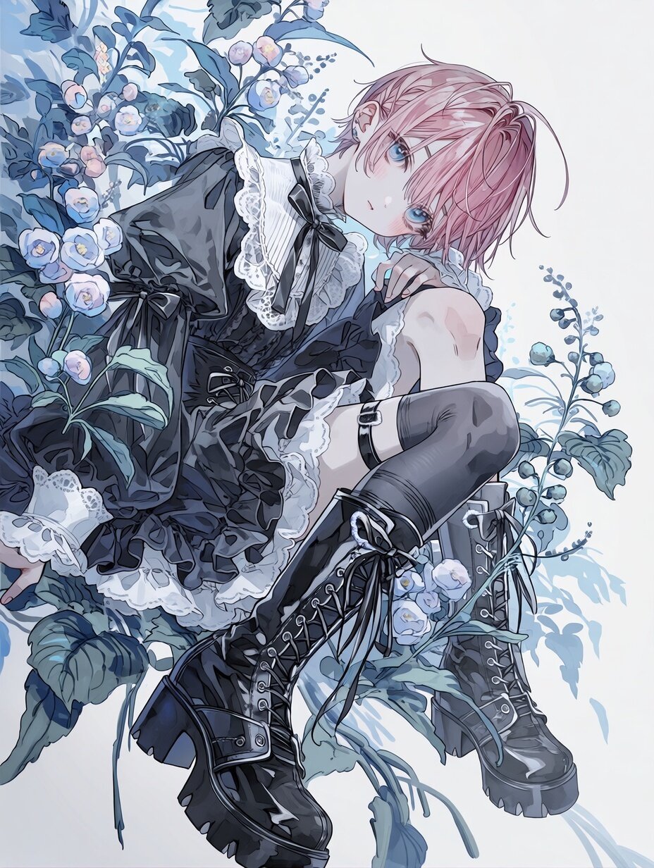 A soft pink-haired, short-haired, adorable cute boy with blue eyes, black Gothic off shoulder dress,white under lace,black short boots,dynamic pose,dynamic angle,background Gothic flower garden