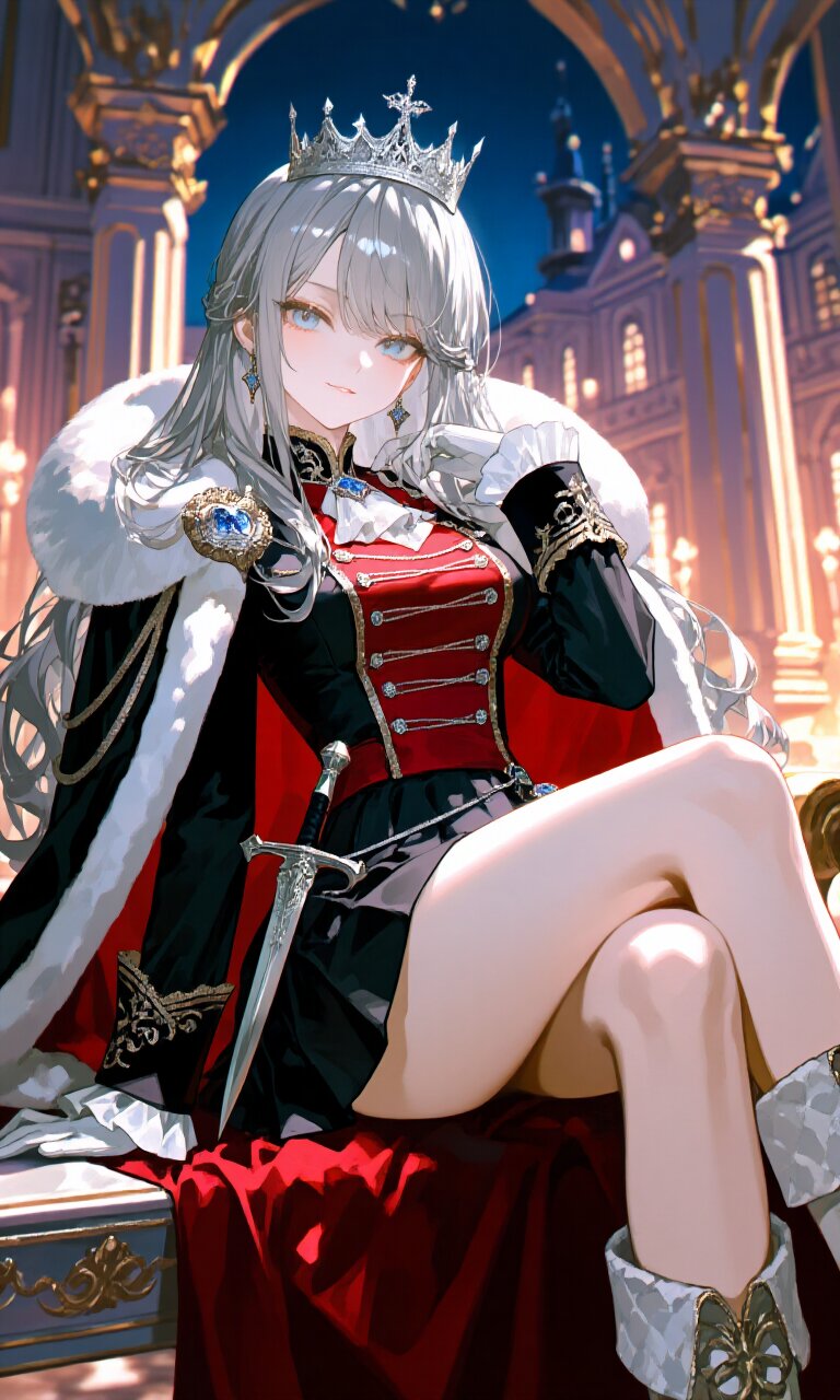A stunning silver-haired lady with a delicate, cute face and mesmerizing blue eyes sits elegantly on a (luxurious chair:1.5) in a grand Rococo-style palace at night. Her long, flowing silver hair cascades down her shoulders, exuding an air of royalty. She wears a (Darkred luxurious prince costume:1.4) with intricate embroidery, paired with a (Black luxurious cape:1.2) draped over her shoulders. A (luxurious mini skirt:1.4) peeks beneath, while long sleeves and (luxurious White gloves:1.2) complete her refined attire. A (luxurious crown on head:1.2) glimmers under the soft lighting, and a (dagger on waist:1.3) adds a touch of danger. Her legs are crossed, and she wears (luxurious White Boots:1.3), enhancing her commanding yet seductive presence. The background features ornate Rococo architecture with gilded details, bathed in a romantic, bloom-lit atmosphere. The scene is rich with intricate textures—from the velvety fabrics to the polished marble floors—creating a chill yet opulent mood. The art style is hyper-detailed, emphasizing every delicate fold of fabric, strand of hair, and architectural flourish, resulting in a breathtakingly lavish illustration.
