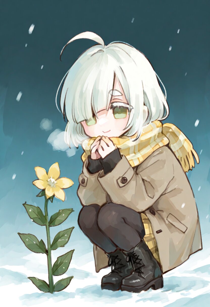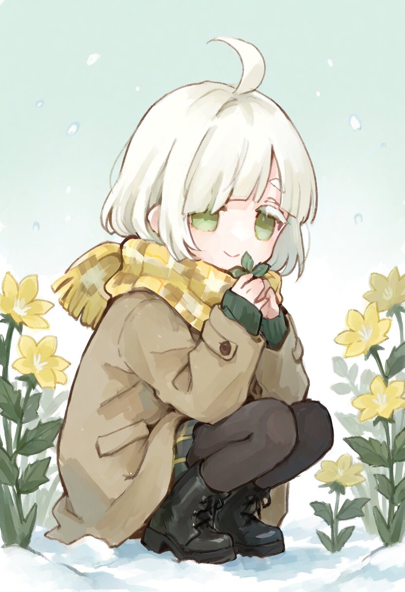 <lora:inmnstyleilxl:0.9>, chibi, solo, 1girl, squatting, yellow flower, snow, point at flower, (bright white hair), short hair, blunt bangs, white thick eyebrow, white colored eyelashes, (hair over one eye), ahoge, mint green eyes, yellow plaid scarf, oversize brown coat, sleeves past wrists, black tights, black lace-up boots, smile, ultra-detailed, best quality, masterpiece, very aesthetic, watercolor painting, general