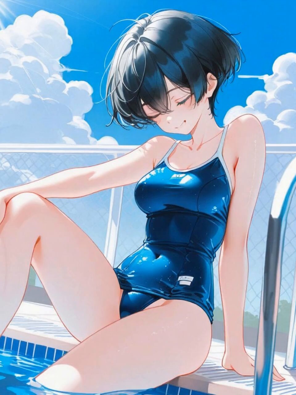 school_swimsuit,old_school_swimsuit,in_pool_1girl,mesugaki,early teen,loli,tan,slender,black hair,short hair,medium breasts,narrow_waist,giggling,An outdoor competitive swimming pool scene where a woman floats calmly on her back on the water’s surface, arms and legs naturally spread in a relaxed pose, wearing a gentle and kind smile, with clear blue water reflecting the blue sky and white clouds above, white lane lines stretching into the distance, and bright sunlight softly shimmering across the water surface