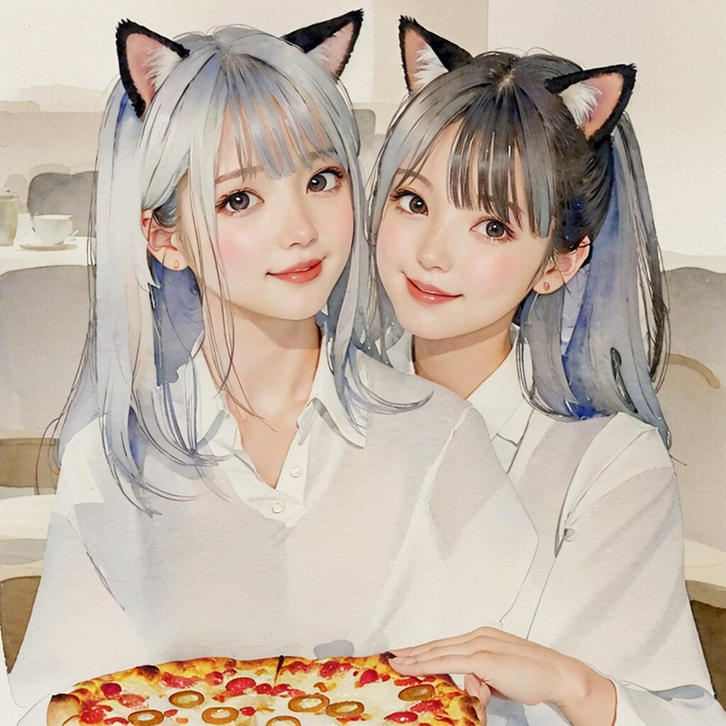 best quality, masterpiece, (dreamy watercolor painting:1.4), (line art:1.2), (illustration:1.1), (cel anime:1.0) Portrait, (face focus:1.6), (close up:1.4), soft lighting, soft shadow, light on face:1.4, 1 girl, detailed face,beautiful detailed eyes, half updo, Tables and chairs, cafe, restaurant, (holding pizza:1.2), (smile:0.3), cat ears, white shirt, looking at viewer,