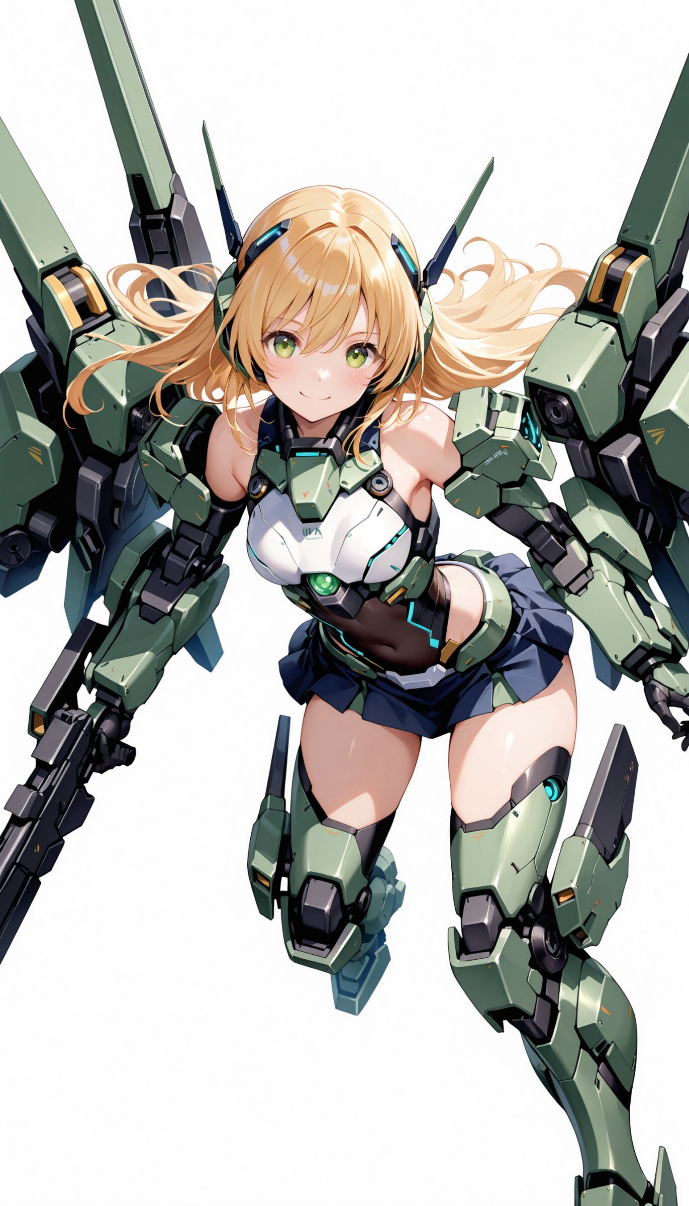 1girl, ((white background)), ultra detailed 8k cg render, masterpiece, high resolution, extremely detailed, mecha musume,mecha shoulder, mech leg, headgear, mecha armor, ((mini skirt)),long blonde hair, dropping green eyes, smile, dynamic posing,