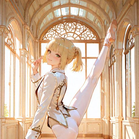 A young 10-year-old girl with a (childish look) stands in a dynamic pose, exuding cheerfulness with an open mouth and a light smile. She has blonde and pink messy short hair with crossed bangs, tiger ears, and a long tiger tail peeking from under her skirt. Her slanted yellow eyes and sharp teeth add a playful, mischievous charm to her delicate face. She wears a (White luxurious Prince costume with pink trim:1.6) with long sleeves, a (luxurious Pink Cape:1.3) flowing behind her, and a (luxurious white pleated mini skirt:1.4) that reveals her (small bottom), thin thighs, and legs covered in (luxurious black thighhighs:1.3). Her hands are adorned with (luxurious White Gloves:1.3), and atop her head rests a (luxurious crown:1.4). A (smooth Baseball bat:1.3) hangs at her waist, adding an unexpected contrast to her royal attire. The background features a grand Palace with modern architecture, surrounded by blooming flowers under the soft afternoon sunlight, with sunbeams and lens flare enhancing the light, romantic academia atmosphere. The image is insanely detailed, photorealistic, and masterfully rendered, capturing every intricate texture of her clothes, skin, and hair.