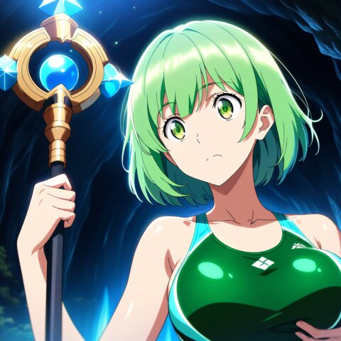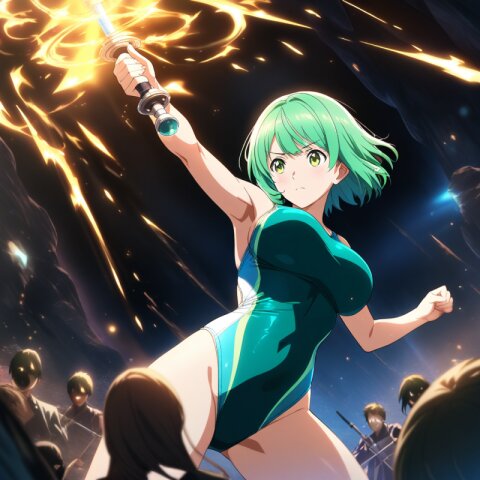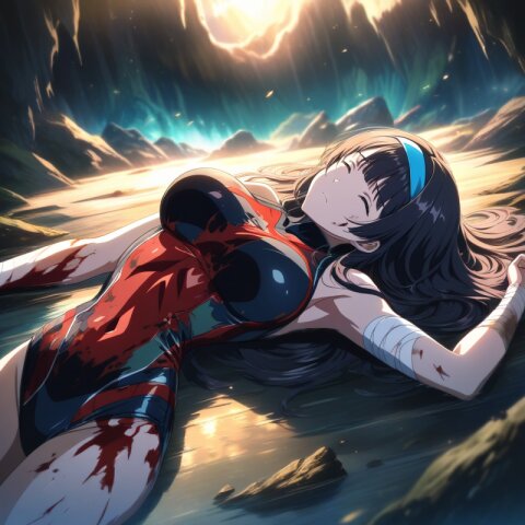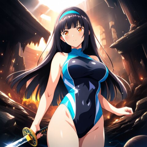 ((masterpiece)), ((best quality)), (ultra-detailed), Dark underground cave, stalactites, water droplets, mossy rocks,cowboy shot, a cute girl,Large bust , Black Racing-style swimsuit, beautiful black hair, beautiful orange eyes, ((beautiful eyes)),straight hair, (blunt hair), (blue hairband),Holding a weapon in hand, gripping katana, Battle scene,Dynamic Angle,Dynamic Pose,horrified,Epic Battle Scene,determined