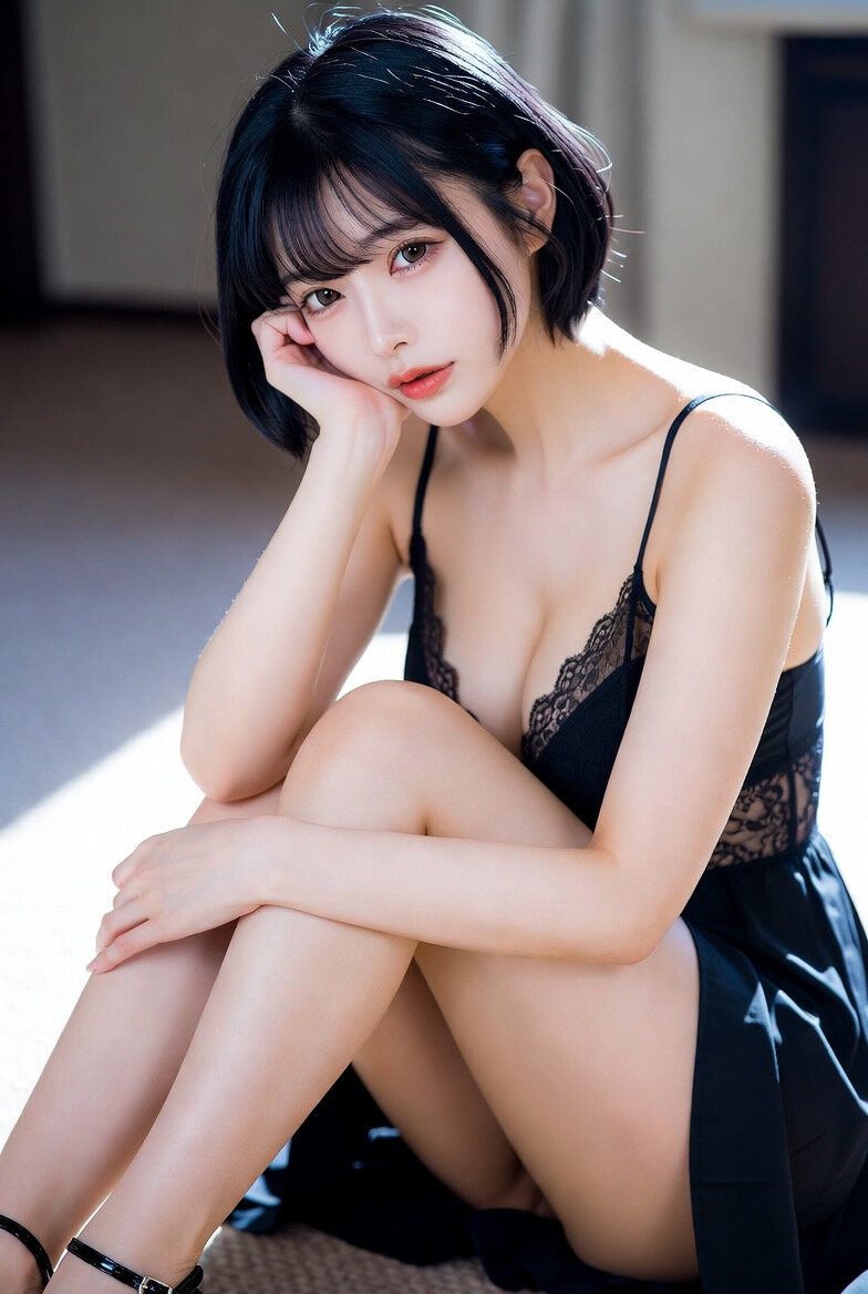 24歳の可愛い日本人女性、黒髪ショートボブヘア、ぱっつん前髪、色白肌、大きな瞳、少しぽってりした唇、憂いのある表情、右手で頬杖をついて考え込むような顔、黒いレースのキャミソールワンピース、肩紐細め、胸元少し開いたセクシーな黒レースドレス、ミニ丈、しゃがみ込みポーズ、膝を寄せて両腕で抱え込むように座る、ハイヒールサンダル、室内、自然光が窓から差し込む柔らかい日中、背景にカーペット敷きの床、ほのかにレトロな雰囲気、リアルフォト、超高精細、詳細な肌の質感、繊細なレースの質感、cinematic lighting、プロのカメラマンによる撮影。