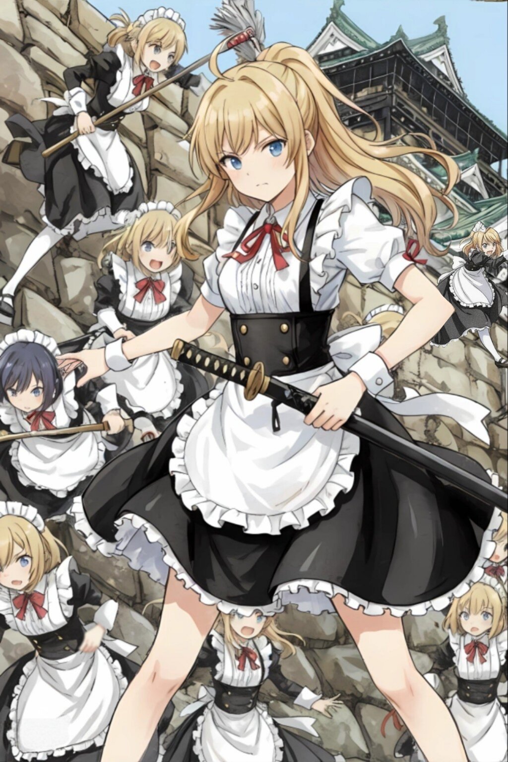 full body shot, anime style illustration, a blonde anime girl with long hair tied in a ponytail, wearing a detailed maid uniform with a black apron, white frills, and a red ribbon, holding a Japanese sword (katana), sharp blue eyes, determined expression, surrounded by other maids with various hair colors and expressions, traditional Japanese castle in the background, stone walls, clear sky, vibrant colors, dynamic composition, action scene