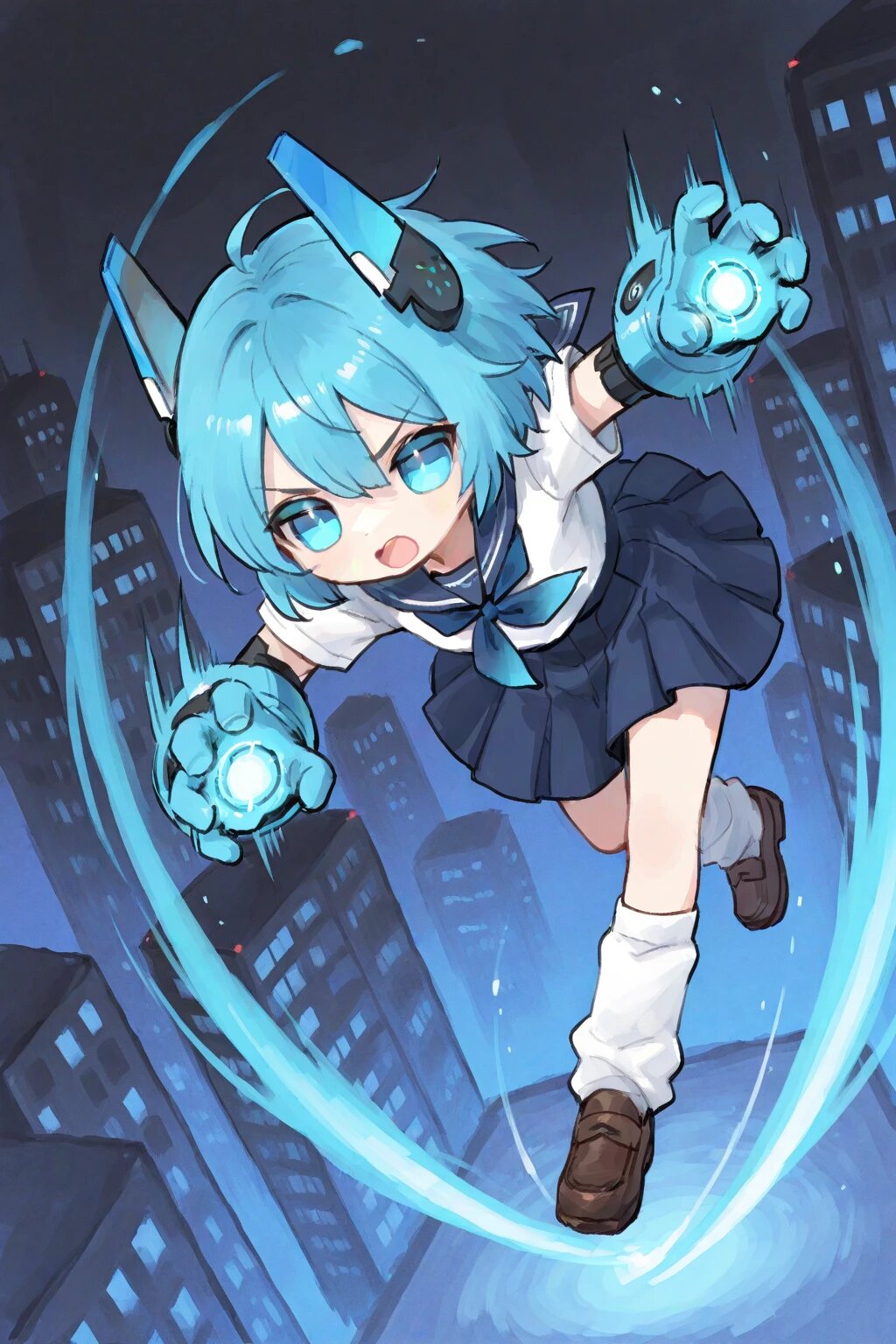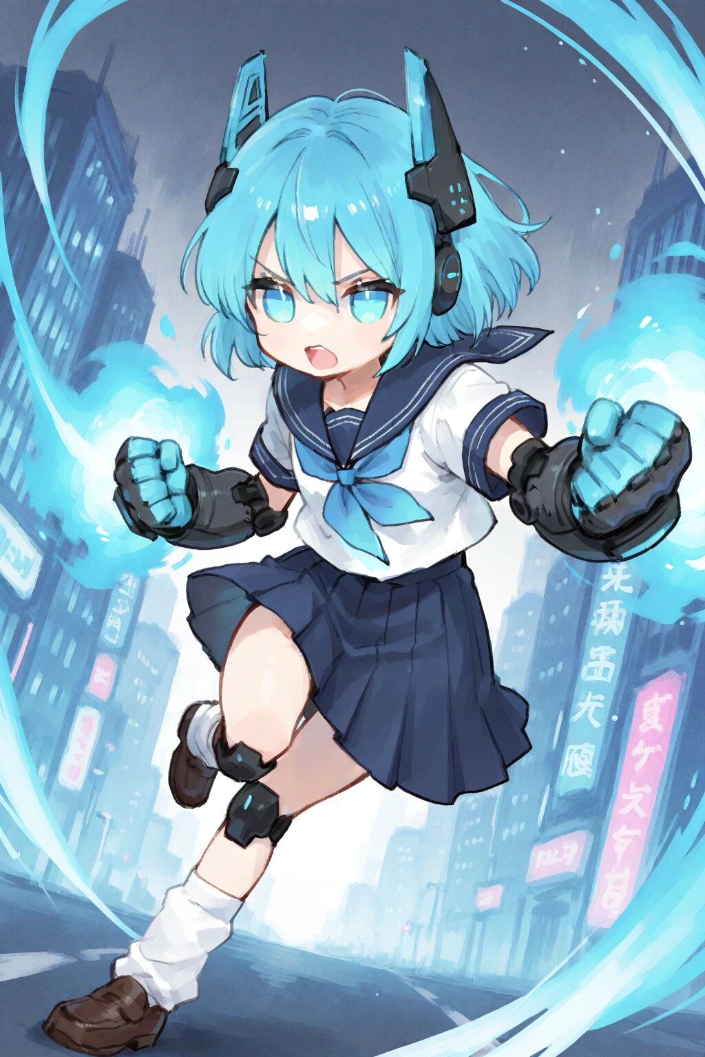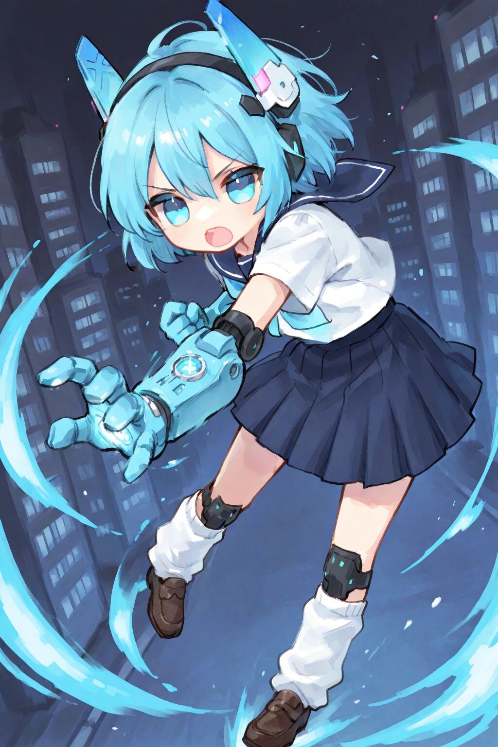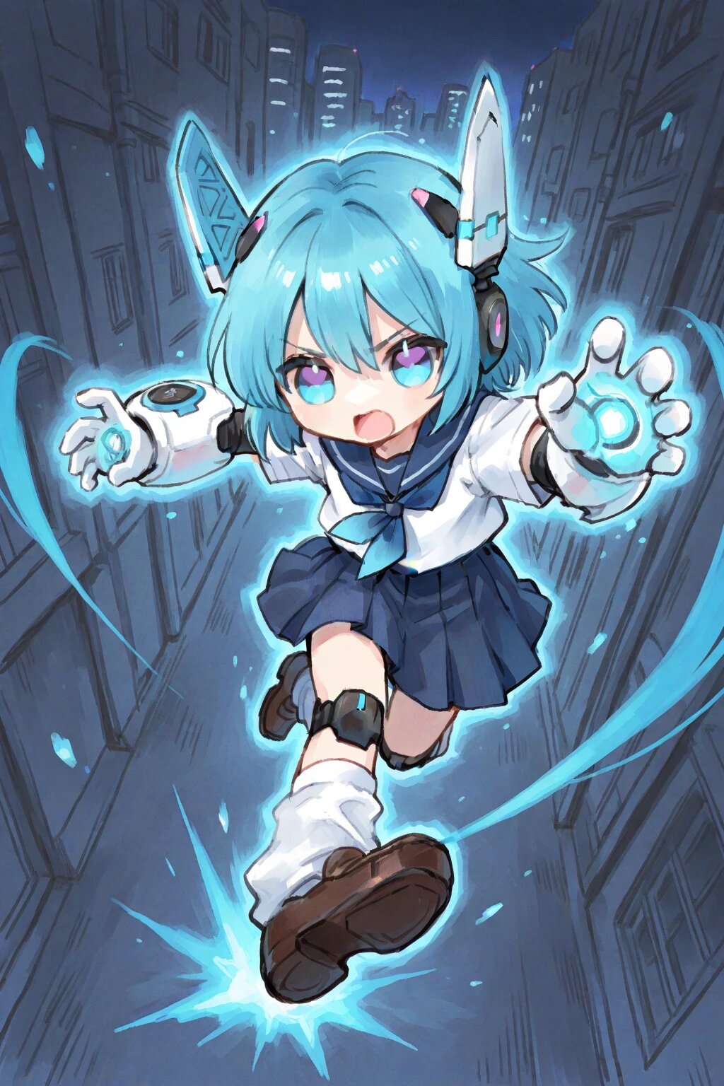 chibi, solo, 1girl, action pose, dynamic angle, neon city, motion blur, mechanical arms, mechanical legs, head gear, ultra-detailed, glowing blue hair, short hair, glowing blue eyes, blue sailor collar, white tops, blue pleats skirt, loose socks, brown loafer, serious expression, open mouth, best quality, masterpiece, very aesthetic, watercolor painting, general