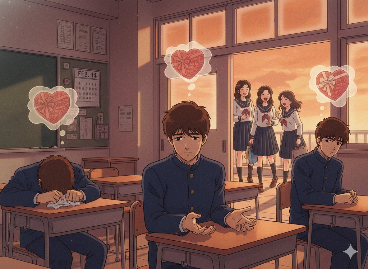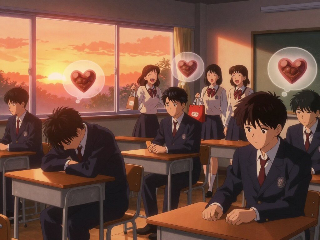 An 1980s retro anime-style illustration of a Japanese high school classroom at sunset on February 14th. The room is filled with a melancholic orange glow from the setting sun, casting long shadows that emphasize the loneliness. In the foreground, several teenage boys in classic dark gakuran (high-collared uniforms) look utterly dejected. One boy is slumped over his desk in despair, while another stares blankly at his empty hands. In their thought bubbles, there are faded, glowing images of heart-shaped chocolate boxes, representing their unfulfilled hopes. In the background, visible through the classroom door, happy female students are walking away together, laughing and holding small gift bags. The atmosphere is thick with "tragic comedic" sorrow, capturing the crushing realization that the day is ending without a single chocolate. High detail, vintage grainy texture, nostalgic atmosphere.