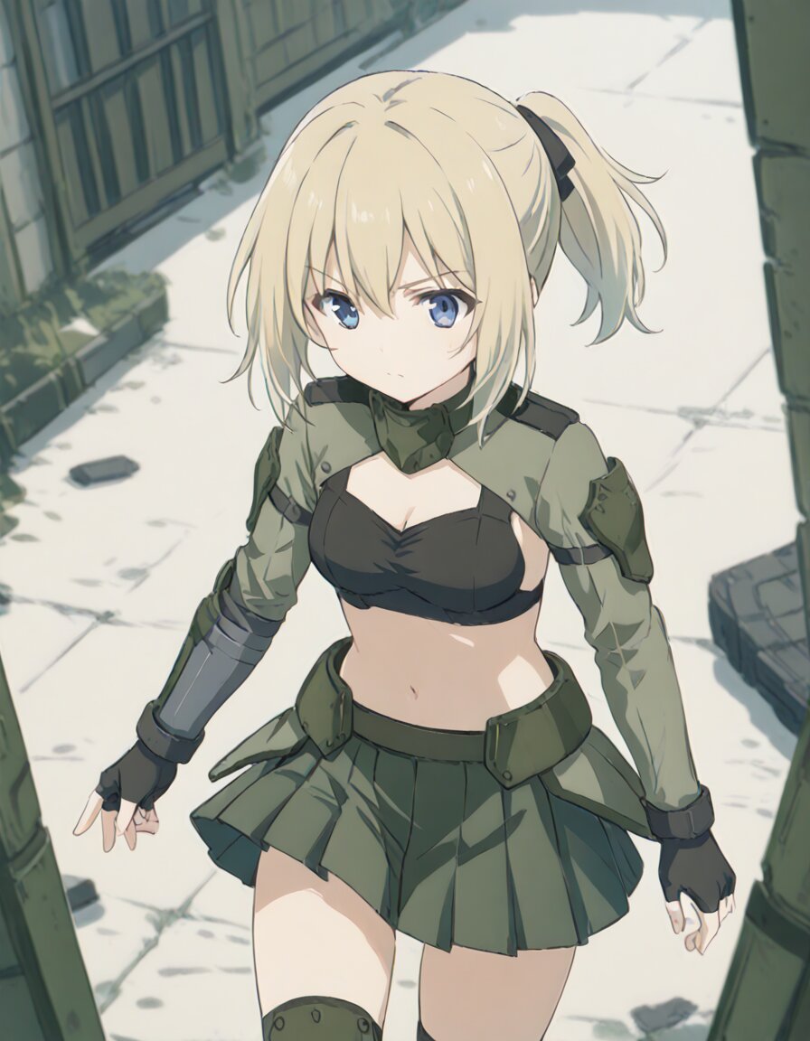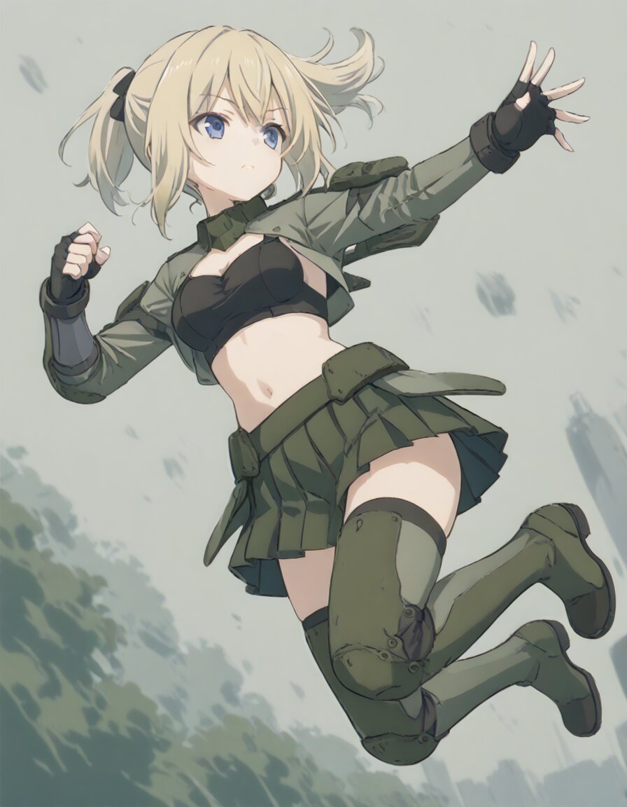 score_9, score_8_up, score_7_up, score_6_up, score_5_up, score_4_up, source_illustration BREAK 1girl, solo, <lora:DollsNest_MyDoll_Pony:1>, mydoll, single ponytail, blonde hair, bangs, medium breasts, blue eyes, midriff, navel, green jacket, long sleeves, black gloves, fingerless gloves, green skirt, pleated skirt, cleavage, jumping, thighhighs, thighhighs under boots, thigh boots, shoe soles, zettai ryouiki