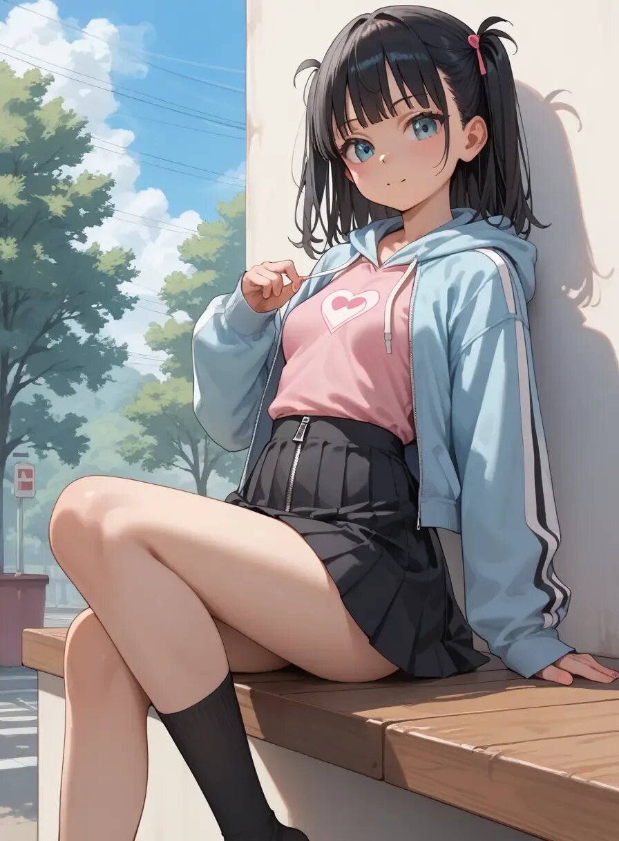 Anime-style outfit, light blue hoodie with the zipper fully open, pink inner shirt, black mini skirt, black over-knee socks, emphasized thigh gap (zettai ryoiki)