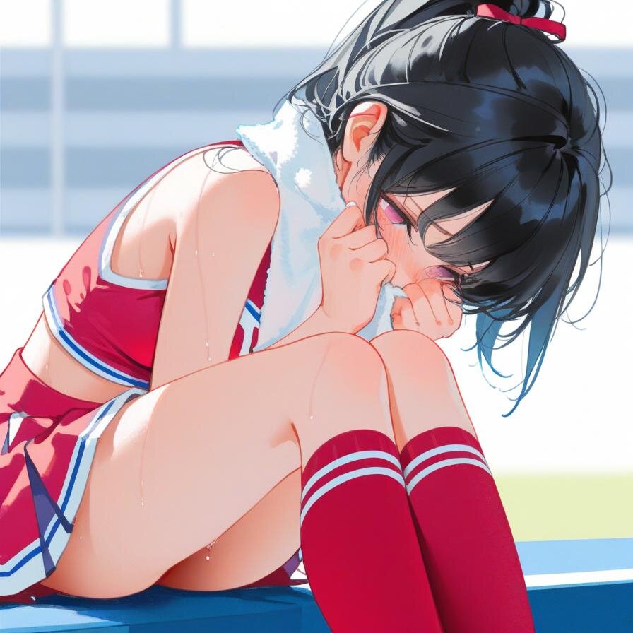 Red sleeveless cheerleader outfit, red over-the-knee socks, strong contrast between thighs and socks, post-exercise sweat on skin, slightly high-angle view, very close distance, leaning forward posture, cheerleader holding out a face towel with both hands, narrow corridor with white walls, background blurred with shallow depth of field