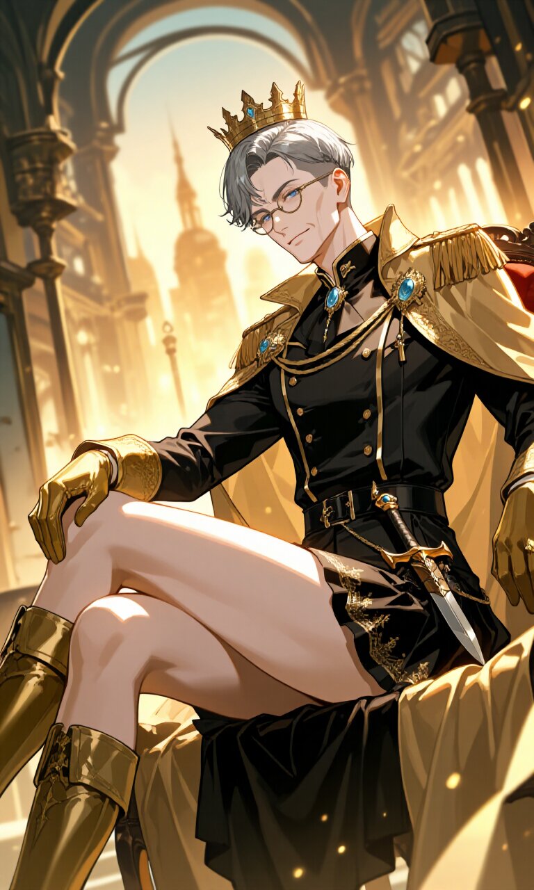A handsome middle-aged man in his late 50s sits regally on a (luxurious chair:1.5) in a grand steampunk palace during golden hour sunset. His striking features include a chiseled, delicate face with piercing blue eyes accentuated by circular silver eyewear, framed by short silver hair with shaved sides. He wears an opulent (Black luxurious prince costume with antique gold trim:1.4) paired with a (luxurious Black mini skirt with gold embroidery:1.4), draped with a flowing (Sepia luxurious cape:1.2). His attire is completed with (luxurious antique gold gloves:1.2), a (dagger on waist:1.3), and a (luxurious crown on head:1.2). His bare thighs contrast with the (luxurious antique Gold Boots:1.3) as he sits cross-legged, exuding confidence with a light smile. The background features intricate steampunk architecture with brass fittings and ornate detailing, bathed in warm, soft lighting with subtle bloom effects. The romantic, hazy atmosphere enhances the chill yet majestic mood. The illustration style is hyper-detailed, showcasing outstanding intricacies in textures—from the fabric’s embroidery to the metallic sheen of accessories—with anti-aliasing for flawless rendering. The composition balances cinematic framing and intimate portraiture, emphasizing his dual role as a fortune teller and producer through his enigmatic yet commanding presence.