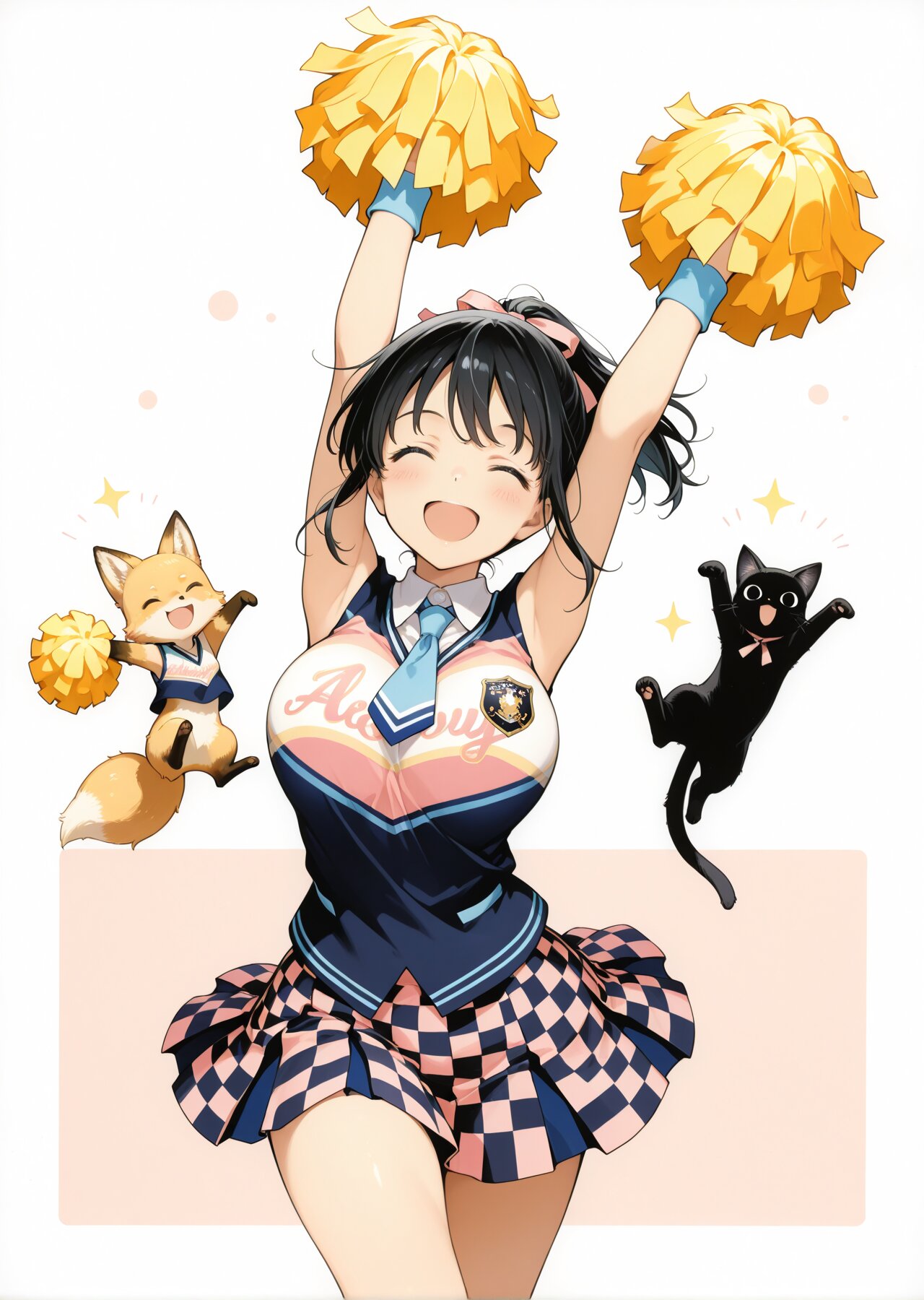 Best quality, Masterpieces, simple background, negative space, anime-style illustration, white background, fine detail, smile, open mouth, closed eyes, 1girl, (young girl), cute face and eyes, big breasts, black hair, clear black eyes, single short ponytail hair, cute and lovely, Vigorous, lively, and spontaneous personality, dynamic pose, cheerleader outfit with vintage schoolgirl feel, checkered pattern on skirt, sleeveless vest-style top with simple emblem, ribbon necktie, matching wristbands, old-school charm and warm color tones, happy, cute small fox cub, a black cat, cheering, two-tone background, soft pastel colors, minimalistic, solid color, no texture