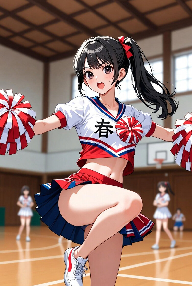 イラスト:日本人女性のcheerleader, wearing 立春をモチーフにしたユニフォーム, holding pom-poms in both hands.背景は体育館の中。力強いポーズ。