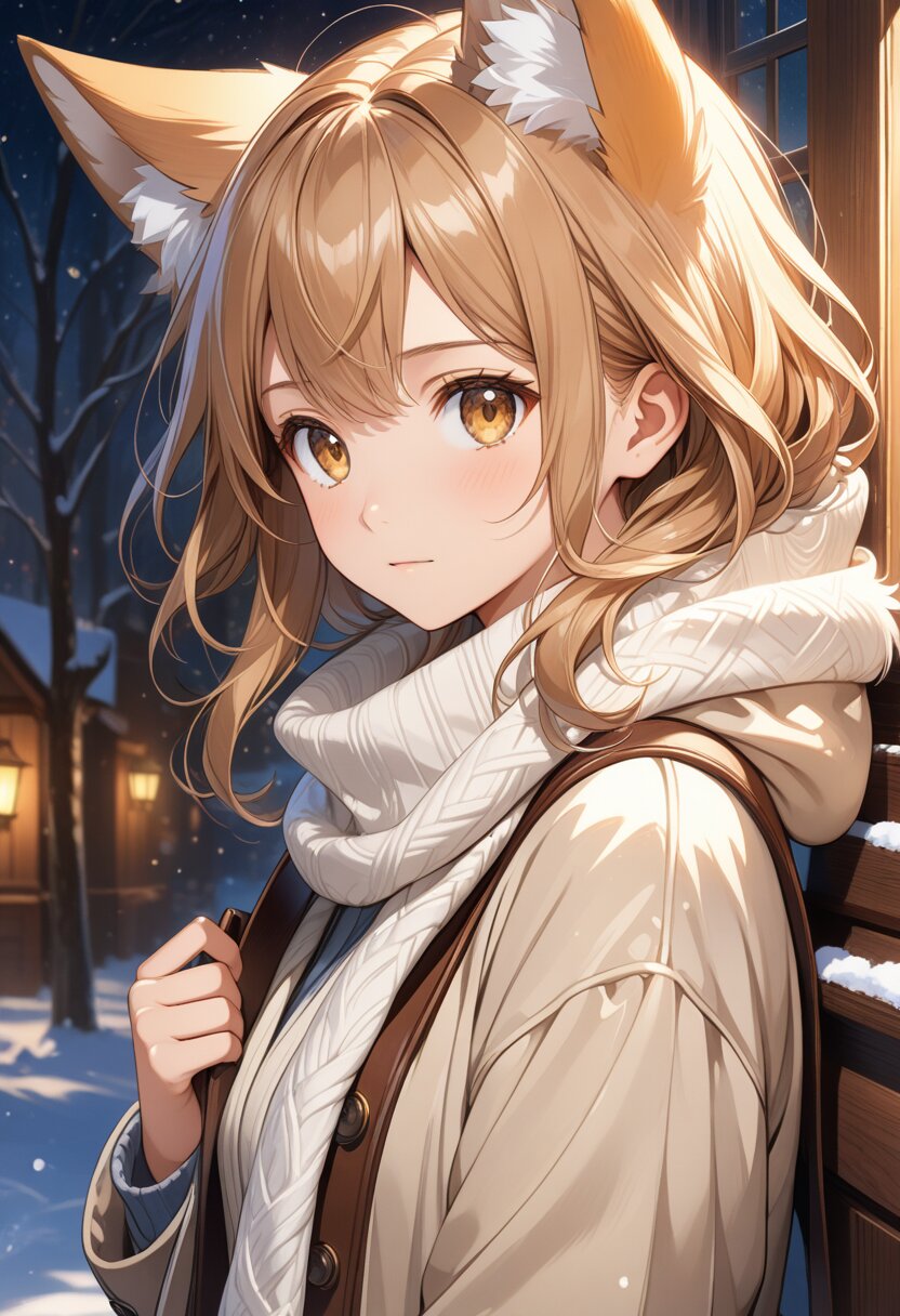 (high resolusion,illustration,ultra detailed 8k art,extremely detailed CG,official art,clothes reflecting light,detailed shiny skin,detailed background:1.3), ((highly detailed beautiful face and eyes),anime_style, fox_ears, girl, light_brown_hair, double_eyelids, long_eyelashes, fluffy_tail, duffle_coat, scarf, boots, soft_winter_lighting, expressive_eyes, delicate_features, warm_color_palette, gentle_atmosphere, natural_pose