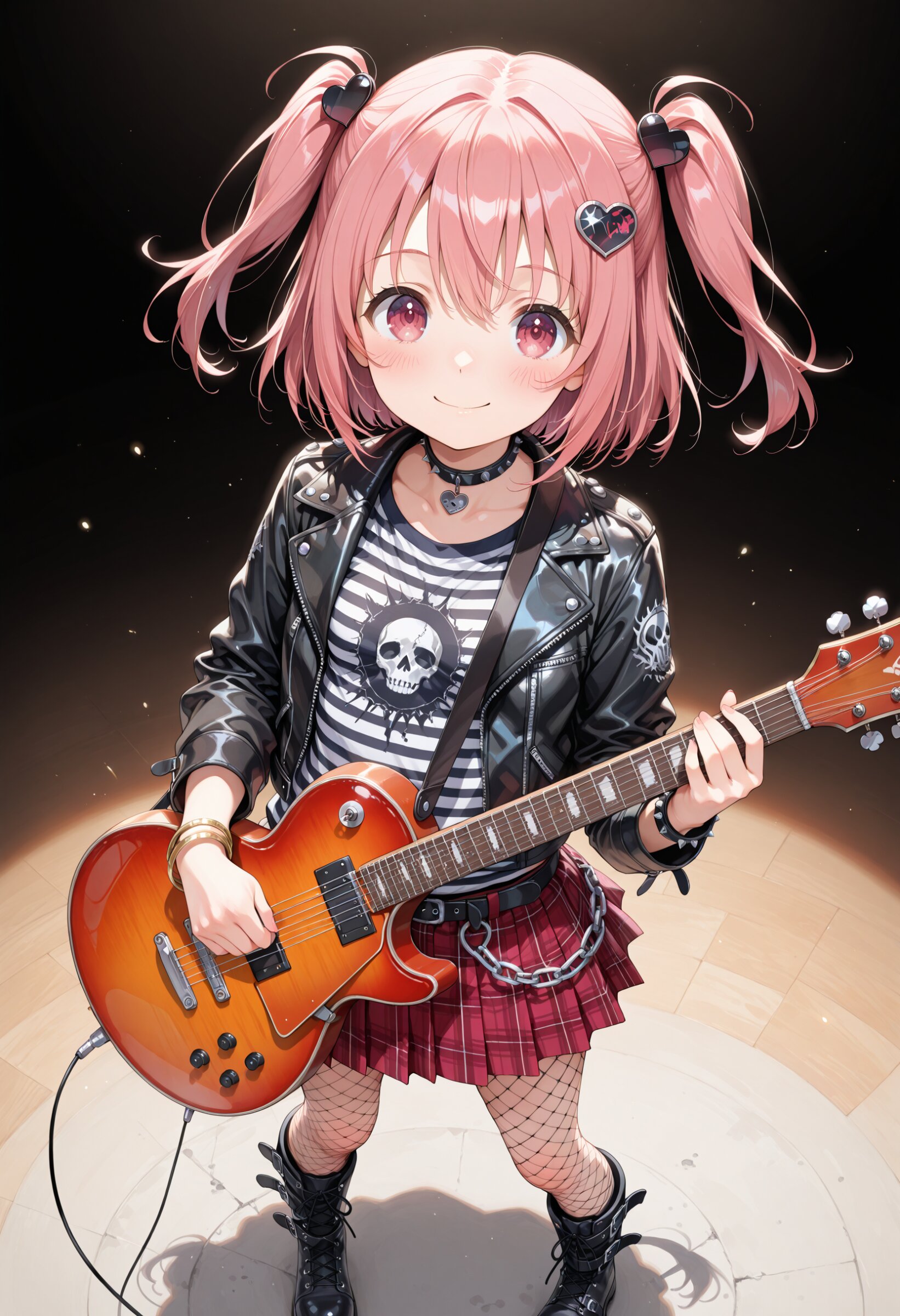 masterpiece,absurdres, highres, ultra detailed, best quality,high quality,high resolution,textile shading,super detailed skin,perfect anatomy, perfect hands,beautiful fingers,beautiful hands,fingertip, Break,1 girl, (8 years old), child,cute,kawaii, (blush), (cheerful smile),young girl, (medium pink hair),dark pink eyes, (two side up),short stature,small breasts, punk rock girl, leather Jacket, striped shirt, stripe, pleated skirt, mini plaid red skirt, black belt, choker, bangle, wallet chain, heart hair ornament, Fishnet tights, punk boots, playing guiter