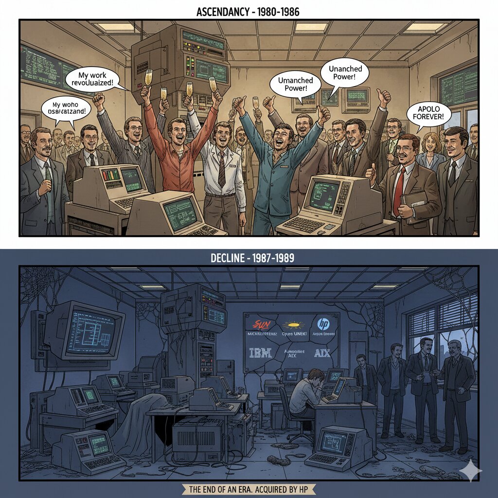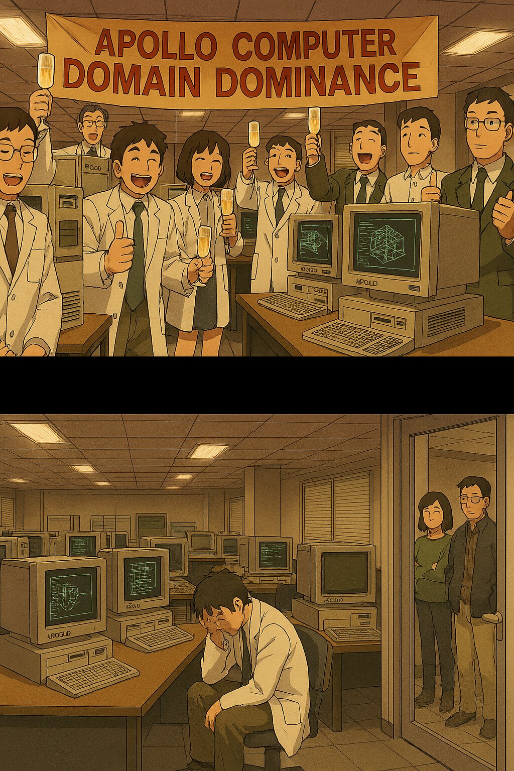 A wide horizontal 2-panel manga/anime style illustration depicting the rise and fall of Apollo Computer over nine years. Panel 1 (left side – prosperity and dominance): Early 1980s high-tech R&D office filled with energy and optimism. Talented engineers and programmers in lab coats and 80s business suits are celebrating a huge technological breakthrough. They are raising champagne glasses, cheering, smiling confidently, and giving thumbs up. The room is packed with users and clients praising them. Large beige Apollo Domain workstations with bulky industrial towers and high-resolution CRT monitors display green code, 3D wireframe graphics, and CAD models. A big banner reads: “APOLLO COMPUTER: DOMAIN DOMINANCE”. Lighting is warm, golden, and triumphant. Atmosphere feels victorious, booming, and full of success. Panel 2 (right side – decline and abandonment): The same office years later, now dark, cold, and nearly empty. Dust, cobwebs, scattered papers, and aging computers. Lights are dim and bluish. Chairs overturned. No customers present. Competitors’ modern machines are visible through the windows in the distance, symbolizing being overtaken. Old Apollo workstations sit unused. A small “CLOSED” sign on a monitor. A lonely crow perched inside to emphasize silence and failure. Mood is melancholic, stagnant, and forgotten. Engineers and users are gone. Art style: Retro 80s–90s anime aesthetic (similar to Patlabor or Akira office scenes), clean line art, detailed mechanical designs, vibrant cel-shading, cinematic lighting, strong emotional contrast between panels, high detail, sharp focus. Composition: Single image, split into two equal panels, wide landscape layout, strong contrast between warm success (left) and cold decline (right).