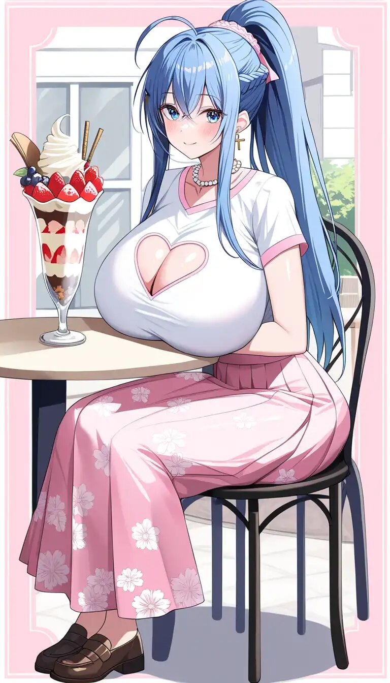 [masterpiece]++, [best quality]++, [ultra detailed]++, [8K]++, [A large heart cutout on the chest is bordered in pink.]++, [floral print long skirt]++, [t-shirt]++,[high ponytail]++, [sitting on chair]++, [full body]++, 1girl, solo, [huge breasts]++, perky breasts, hanging breasts, curvy, [loafers]++, cleavage, [tall]++, [long hair]++, [straight hair]++, [shiny skin]++, [shiny clothes]++, smile, nose blush, closed mouth, In front of the cafe, day, outdoors, pearl necklace, parfait, short sleeves, puffy sleeves, cross earrings,