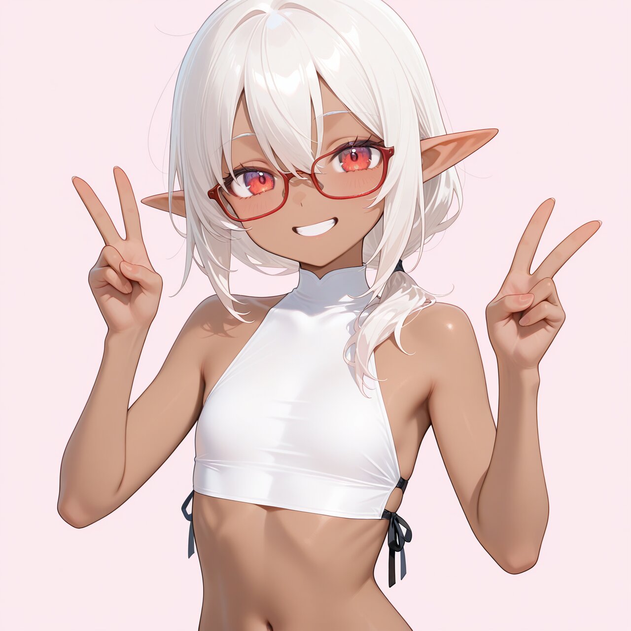 1girl, general, flat color, simple background, light pink background, (beautiful eyes, detailed eyes), looking at viewer, solo, cute, upper body, (dark skin, red-framed eyewear:1.2), white hair, low ponytail, medium hair, hair between eyes, hair over shoulder, flat chest, red eyes, elf, taut crop top, white crop top, sleeveless, midriff, sideless outfit, navel, bottomless, double v, grin, masterpiece, best quality, amazing quality,