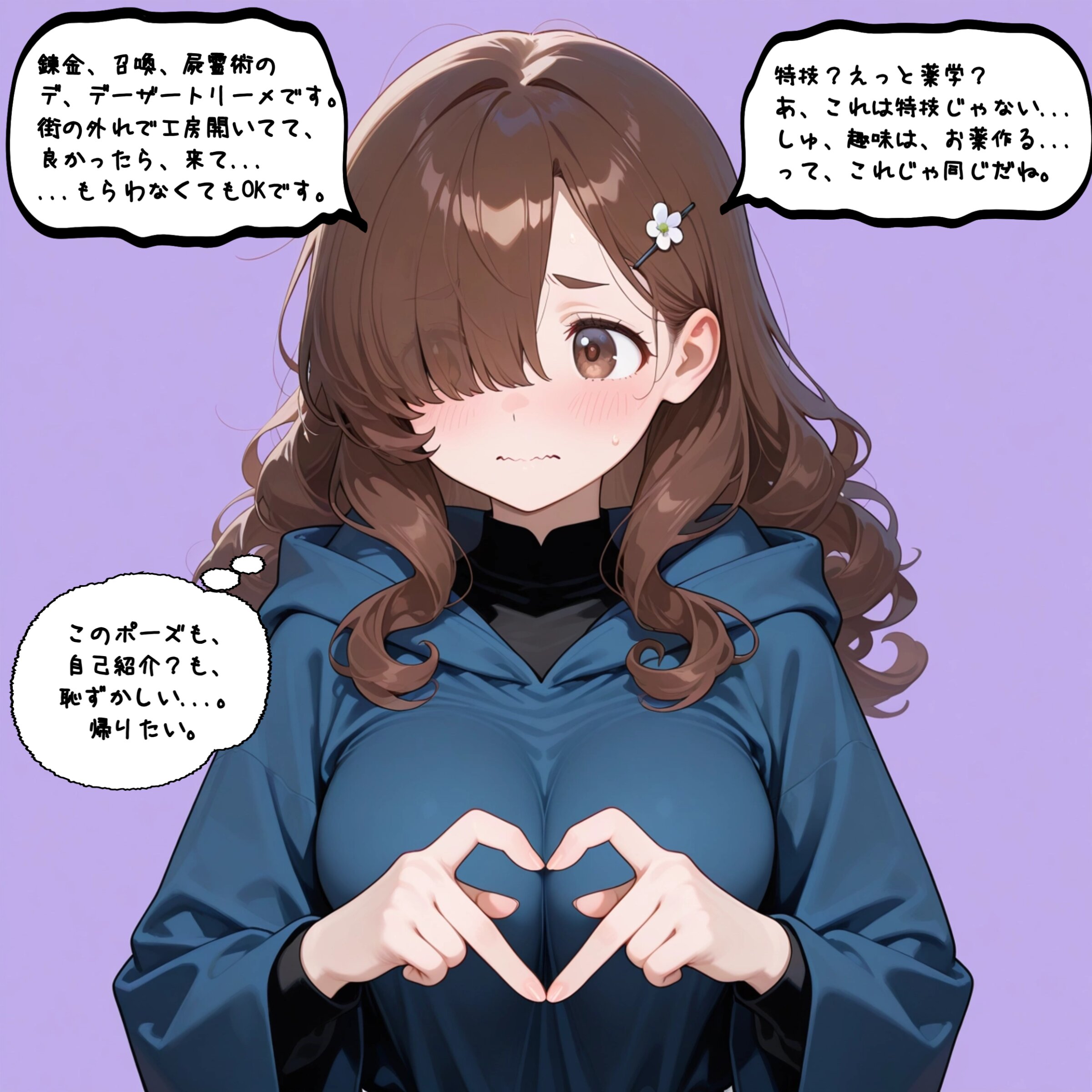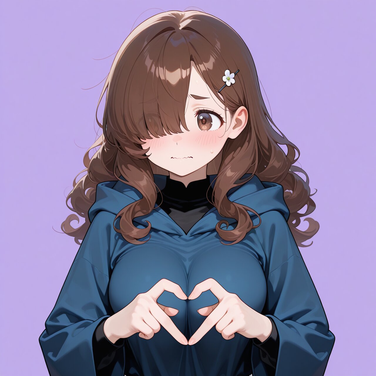 1girl, general, flat color, simple background, light purple background, (beautiful eyes, detailed eyes), looking at away, solo, cute, upper body, (hair over one eye, tareme:1.4), dark brown eyes, dark brown hair, long hair, (curly hair, hairpin), large breast, hooded robe, hood down, dark blue robe, black shirt, long sleeves, down-slanting eyebrows, wavy mouth, closed mouth, blush, embarrassed, 4-finger heart hands, masterpiece, best quality, amazing quality,