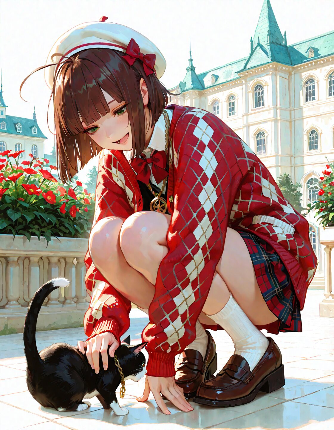 solo,1boy,Brown hair,Green eyes,blunt bangs,ahoge,short hair,straight hair,hime cut,delicate face,delicate hair,beautifully detailed hair,defined detailed face,beautiful detailed eyes,beautiful detailed eyes,catchlight in eyes,masterpiece,best quality,insanely detailed,beautiful,16k,photorealistic,happy,cheerful,gentle smile,half open mouth, cute face,cute pose,squatting,(feet apart knee together:1.3),looking down, white beret with Pastel Red bow, golden chain necklace, (white cable knit turtleneck, long sleeves), Pastel Red oversized cardigan, (argyle pattern cardigan : 1.2), (dark Red mini skirt, plaid mini skirt), Whiteknee-high socks, Brown platform loafers, outside,at the modern garden,(with one cat:1.3), romantic academia,calm atmosphere,very detailed background,rococo architecture,bloom,soft lighting,full body