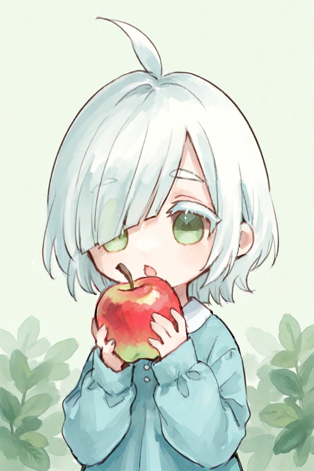 chibi, solo, 1girl, close up, holding apple, apple covered mouth, :o, (bright white hair), short hair, blunt bangs, white thick eyebrow, white colored eyelashes, (hair over one eye), ahoge, mint green eyes, blue dress, sleeves past wrists, ultra-detailed, best quality, masterpiece, very aesthetic, watercolor painting, general