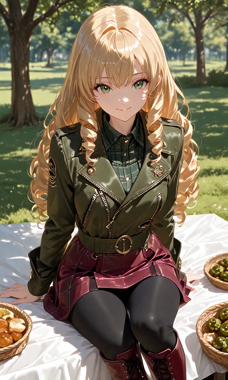 (best quality),(masterpiece),(ultra detailed),1 lady, long hair, drill hair, spiral curls, blonde hair, smile, picnic, ,double riders jacket, olive green leather jacket, wide lapels, belt at waist, Ornament on lapel, tartan plaid shirt, dark red leather skirt, black leggings, lace-up high-heel boots, dark red knee boots, gold buckles
