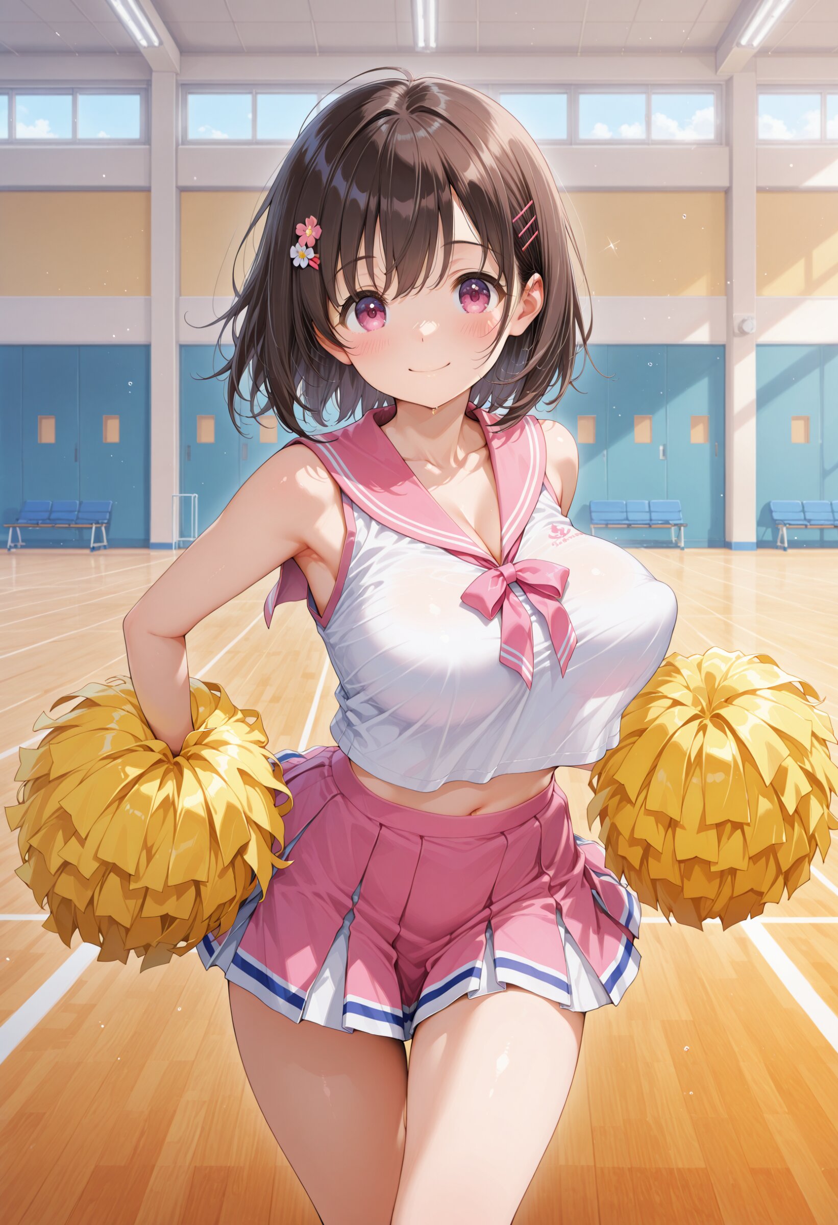 masterpiece, best quality, amazing quality, general, fine detail, official art, 1girl, loli, petite, beautiful hair, beautiful eyes, cheerleader, pink sailor collar, sleeveless, cleavage between sailor collar, midriff peek, beautiful legs, (big breasts:1.2), (perky breasts:1.4), school gym, innocent expression, smile, Practicing dance, dynamic action, Flexible chest that adapts to her movements,