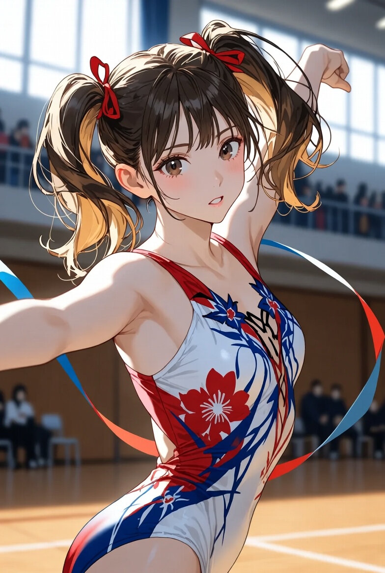 イラスト。日本人女性18歳、新体操部の演技中、プリントのレオタード。明るい体育館の中。hair tied in pigtails,