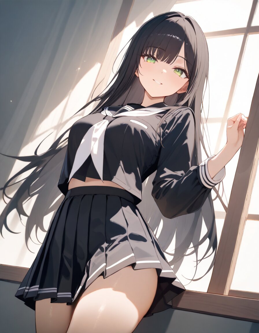 1girl, solo, smile, black hair, long hair, straight hair, green eyes, medium breasts, black serafuku, white neckerchief, black pleated skirt, black high socks, smooth skin, soft sunlight through windows, intimate atmosphere, masterpiece, high score, great score, absurdres, cowboy shot, looking at viewer