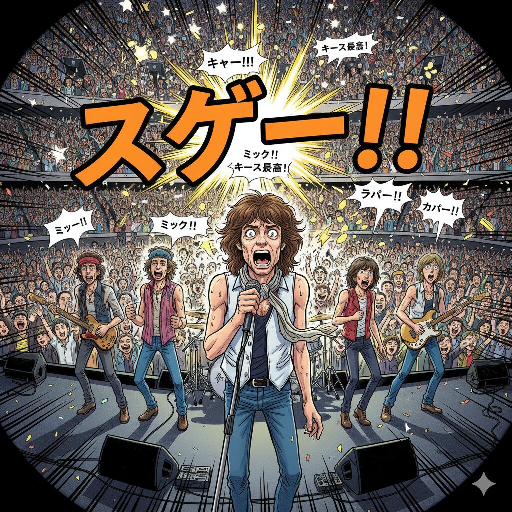 A detailed comic-book style illustration of a legendary 5-member British R&B rock band in their 40s and 50s performing on a massive stage in a Japanese dome stadium. > The scene captures the exact moment the song ends: the band members have sweat-drenched, anxious faces, looking confused and worried because the Japanese audience was so polite and silent during the performance. However, suddenly, a massive explosion of cheers and "SGEEEE!!" (amazing) shouts erupts from the crowd. > The lead singer looks bug-eyed and shocked at the sudden roar. The guitarists are frozen with surprised expressions. The background shows a sea of thousands of Japanese fans jumping and cheering wildly. High contrast between the quiet tension and the sudden loud celebration. Dynamic manga-style speed lines, vibrant colors, and a dramatic wide-angle perspective.