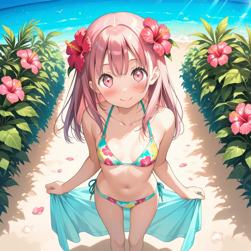 lowres, worst quality, low quality, blurry, deformed, ugly, mutated hands, extra limbs, bad anatomy, bad hands, missing fingers, extra fingers, fused fingers, poorly drawn feet, watermark, text, signature, overexposed, blown-out highlights, harsh lighting, glare, excessive brightness, realistic, 3d render, monochrome, greyscale, jpeg artifacts, extra arms, bad proportions, cropped, strong glow, intense beams, wet ground puddles water reflection rain dew moist damp, bare ground no flowers thin scattered petals, winter snow autumn leaves, dark mood, aggressive pose, looking away averted gaze, long dress clothing covered, pale unhealthy skin, dull colors, no hibiscus, small flowers, indoor, urban, buildings