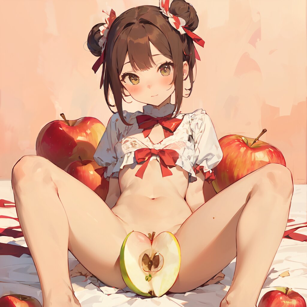 masterpiece, best quality, 1girl, kawaii, brown little double bun, (((((hide her pussy by the cut surface of half an apple))))), wide Ribbon, Wrapping, sit, spread legs, a cut surface of half an apple, hide her chests by ribbon,