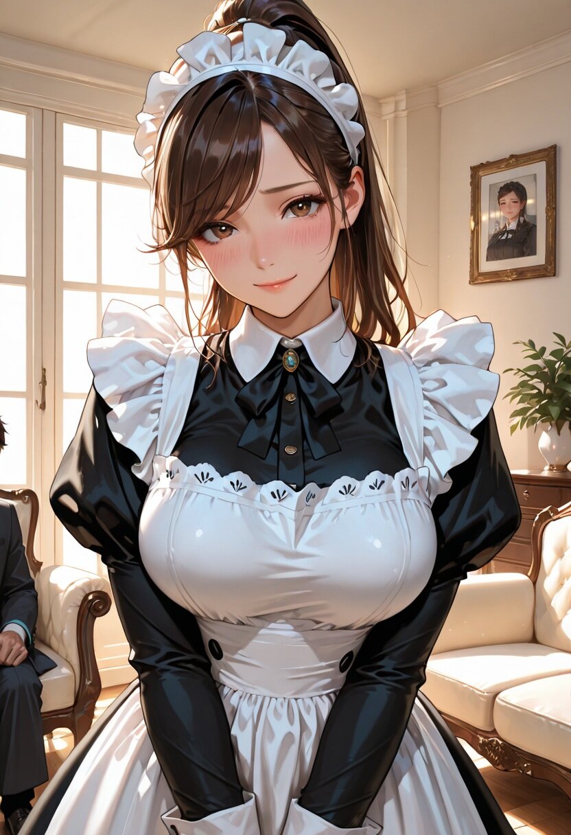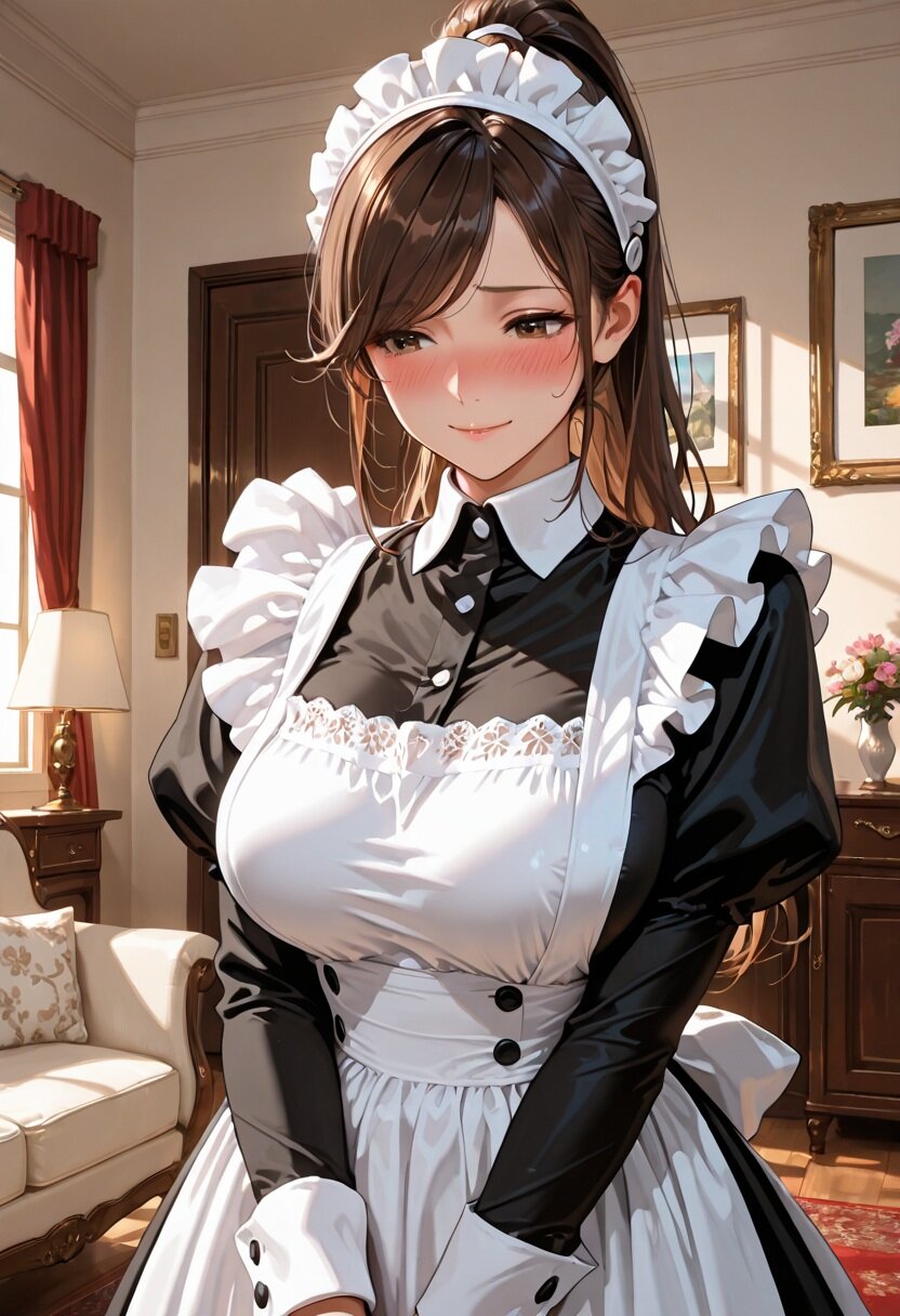 1girl, solo,living room, solo focus, perfect body, detailed face, detailed skin,cowboy shot, victorian maid,maid headband, BREAK beautiful lady, Married woman, 30 years old, (brown hair), swept bangs, high ponytail, large breasts, light smile, blush, embarrassed, BREAK masterpiece, amazing quality, best quality, ultra-detailed, 8K, newest, vivid, dramatic lighting, soft lig