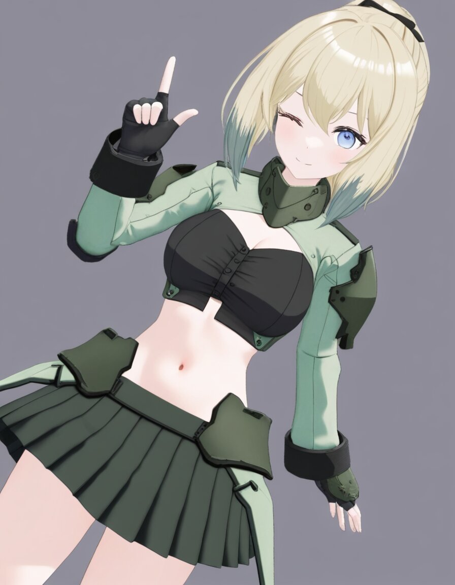 1girl, solo, <lora:DollsNest_MyDoll_ss_IL_test-000018:0.7>, mydoll, single ponytail, blonde hair, bangs, medium breasts, blue eyes, midriff, navel, green jacket, long sleeves, black gloves, fingerless gloves, green skirt, pleated skirt, cleavage, masterpiece, best quality, high quality, finger gun, one eye closed, smile, two-tone background