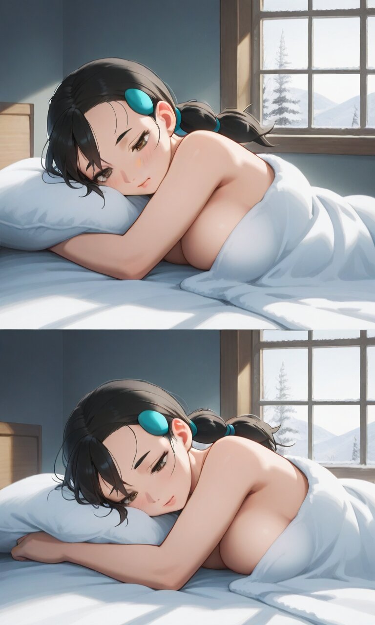 Candice,black_hair, brown_eyes, large_breasts, twintails, hair_ornament, best quality}, {very aesthetic}, {ultra-detailed}, {best illustration} nsfw, perfect hands, perfect face, perfect eyes, perfect light, dynamic light, natural light, full body A young woman waking up in the morning in a snowy country bedroom, soft morning light filtering through frosted window, lying in bed covered only by a thin blanket, completely nude under the blanket, eyes slowly opening, sleepy expression, hair slightly messy from sleep, realistic skin texture, detailed face, gentle blue eyes, subtle morning glow on bare shoulders, calm and relaxed atmosphere, high detail, 8k