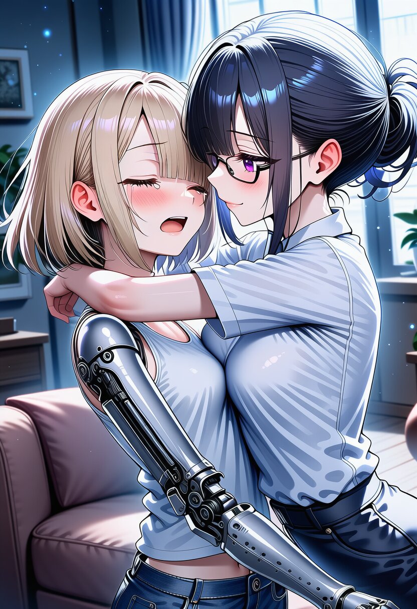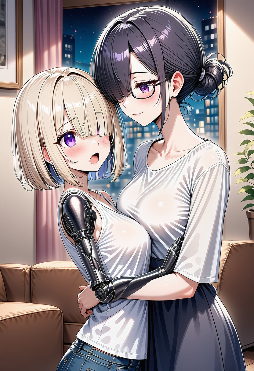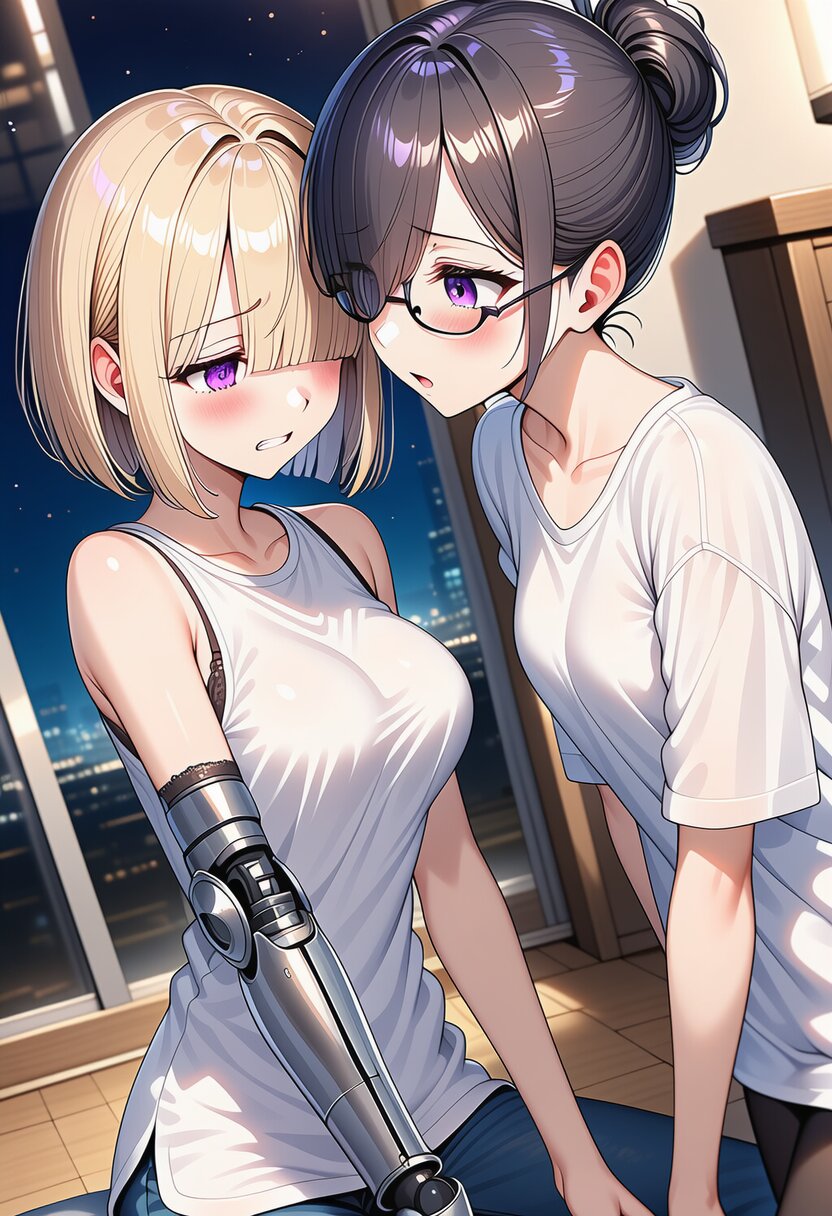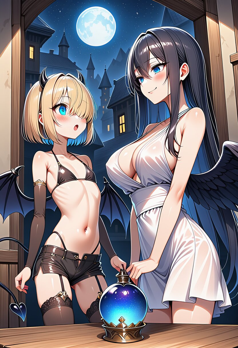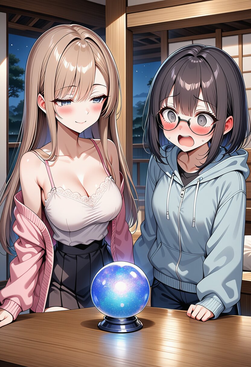 ai-generated, year 2024, anime style, 2girl, side by side, looking at each other, a crystal-ball on table, midnight, indoor, 1.0::japanese living room::, from front, masterpiece, best quality, ultra detailed, perfect fingers, high resolution, absurdres, perfect anotomy, detailed background, unity 8k wallpaper, location, -2.5::looking at viewer::, very aesthetic, masterpiece, no text