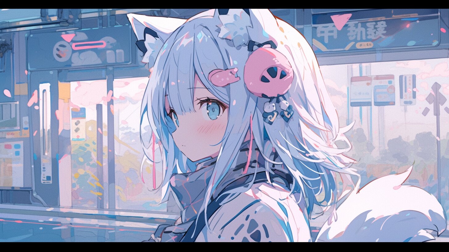 夕暮れのバス停で、青い髪の猫耳少女が振り返る。ピンクのドクロヘアピンが可愛らしく揺れ、彼女の瞳には少しの寂しさと期待が混ざる。街の喧騒から離れたこの場所で、彼女は大切な誰かを待っているのだろうか? 柔らかな光が彼女の白い尻尾を優しく照らし、そこで始まる小さな冒険の予感を漂わせる。日常の片隅で繰り広げられる、心温まる物語の瞬間。