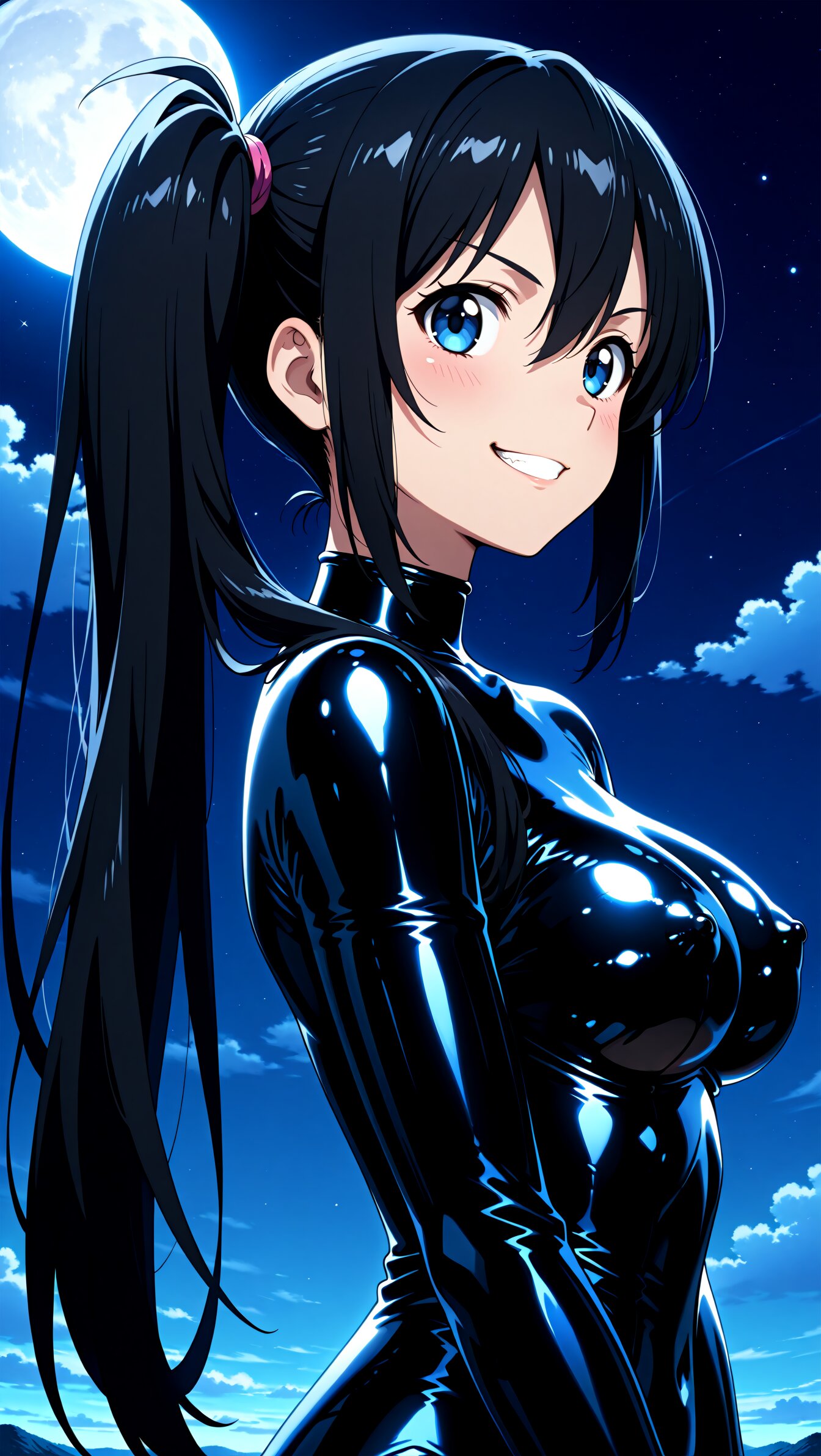 <lora:MeMax6-noob-vpred:1>,memaxl6_a,memaxl6_b,memaxl6_c,memaxl6_d,memaxl6_e, Full HD,32K, 1girl, solo, (from side), ((portrait1.2)), looking up:1.6, looking at viewer, grin, evil smile, v-shaped eyebrows, (night, full moon, natural lighting backlighting, ) medium breasts, (teenage :1.3), (blue eyes), long hair, (long side ponytail:2.0), sideburns, hair between eyes, (((tareme))), (black hair), (beautiful hair), (shiny hair), (medium breasts), slender, blush, shiny clothes:1.8, ((((((black latex bodysuit:1.4)))))), ((black latex clothes:2.0)), (((skin tight))) ,(((tight clothes))), ((((seamless clothes)))):2.0, ((((((((shiny black latex bodysuit, shiny clothes, )))))))), ((black latex gloves)),((((no zippers)))), (covered nipples:1.6), erectile nipples, masterpiece, best quality, super fine illustration, very aesthetic, newest, hyper detailed, intricate, beautiful, aesthetic, highly decorative, HDR, yume kawaii, ,anime screencap,anime,no gradients, 2D flat design, bold outlines, 10's anime style,