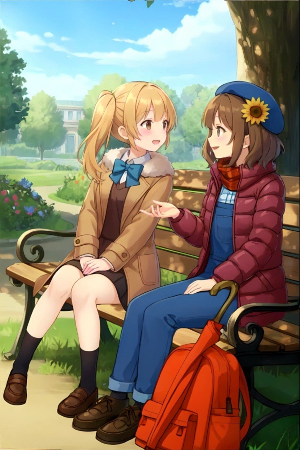 Anime style, full shot. Two cheerful young women are having a pleasant conversation while sitting on a wooden bench in a sunny park. The girl on the left has bright blonde hair tied in a high ponytail, dressed in a brown knee-length coat and a blue bow tie, with a gentle smile. The girl on the right has short brown hair, wearing a warm red puffer jacket over blue overalls, a red scarf, and a blue beret adorned with a sunflower, gesturing with her hand as she speaks. Lush green trees, blooming flowers, and a classical-style building are visible in the bright daytime background, creating a peaceful and friendly atmosphere.