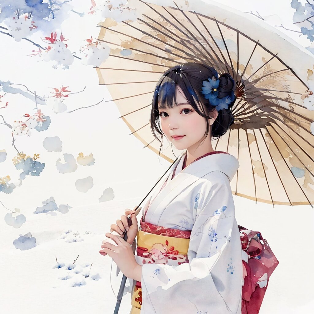 best quality, masterpiece, (watercolor painting:1.34), (line art:1.2), (illustration:1.1), (cel anime:1.2) Portrait, (face focus:1.6), (close up:1.4), soft lighting, soft shadow, light on face:1.4, 1 girl,detailed face, beautiful detailed eyes, (smile:0.9), brown hair, half updo, closed mouth:1.2, kimono, furisode, (snow:1.6), hands on umbrella, oil-paper umbrella,