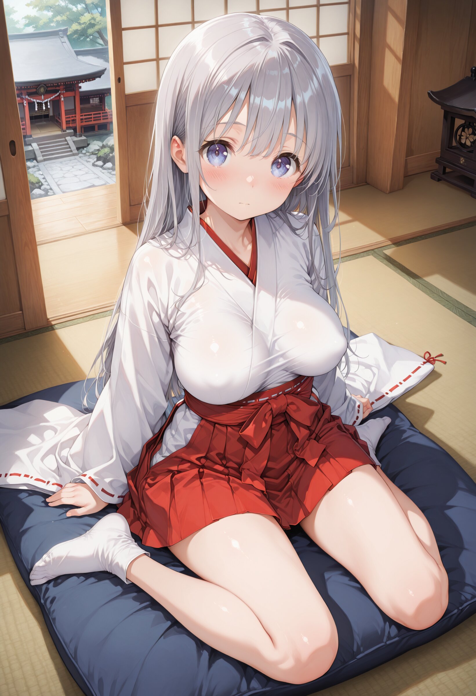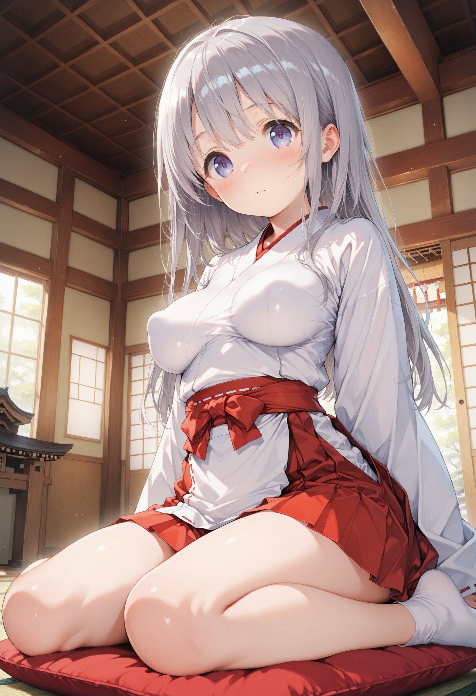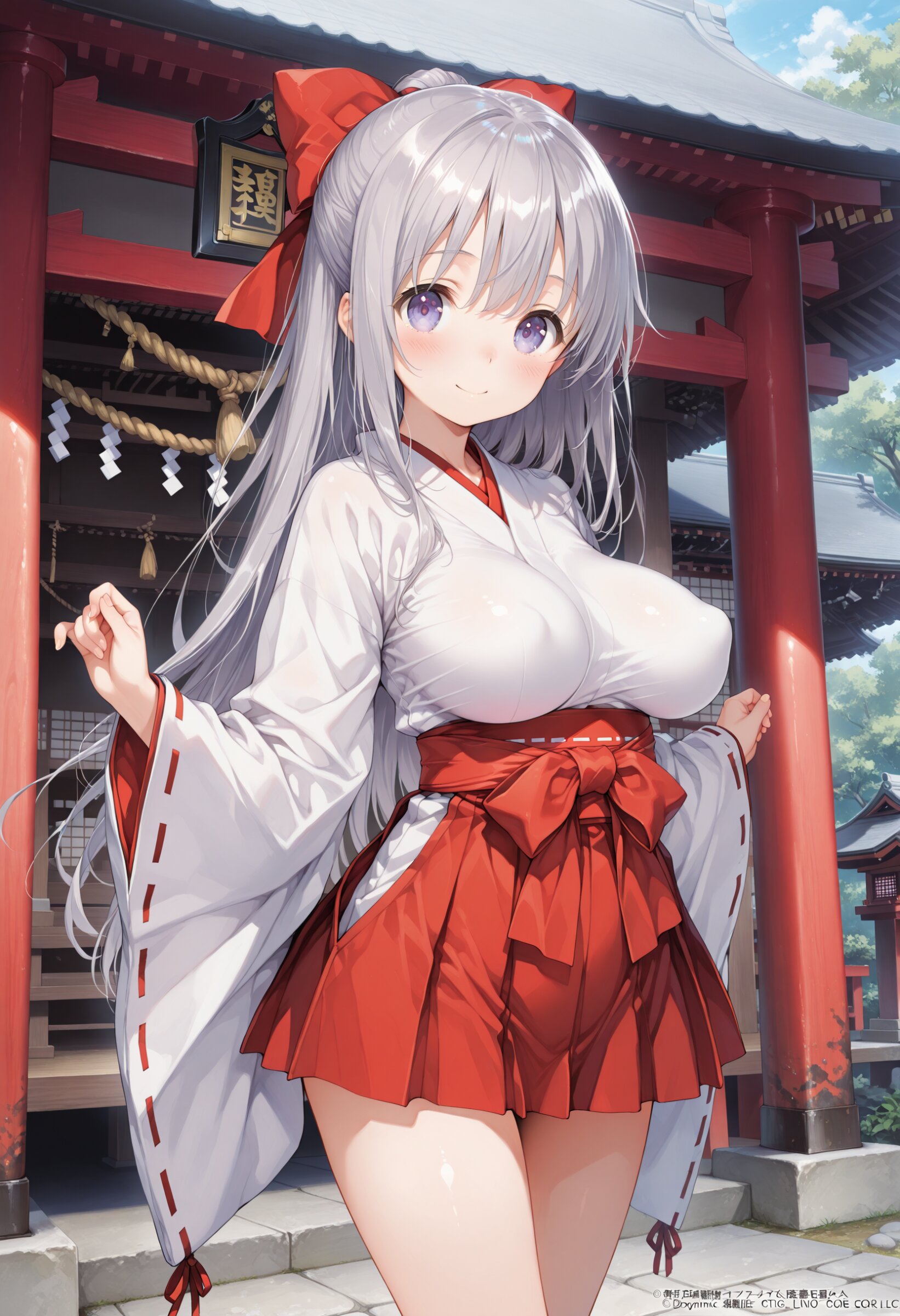 masterpiece, best quality, amazing quality, general, fine detail, official art, 1girl, loli, petite, beautiful silver hair, beautiful eyes, miko, miniskirt, beautiful legs, big breasts, impossible clothes, (perky breasts:1.2), innocent expression, in japanese shrine, Hold a wooden bow, dynamic pose, happy,