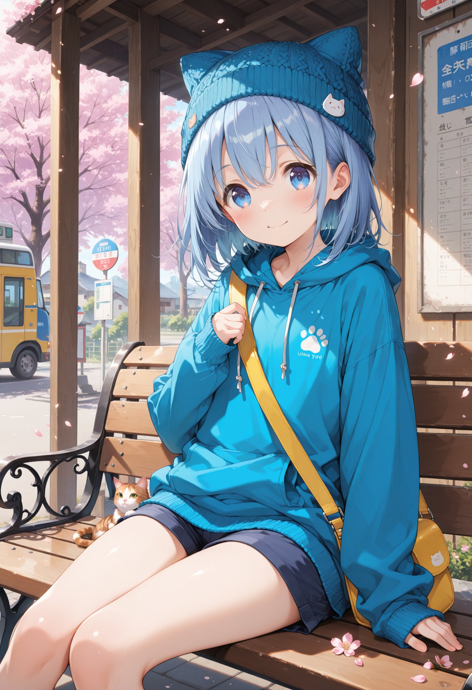 masterpiece, best quality, highres, ultra-detailed, extremely detailed, detailed, 1boy, shota, kawaii, light blue hair, medium hair, blue eyes, cat ear style knitted hat, blue hoodie, short pants, long sleeves, moe sode, Sleeves past wrists, slim legs, spring, bus stop, sitting on bench, countryside, innocent expression, shoulder bag, Cherry blossoms in full bloom, happy, cowboy shot,