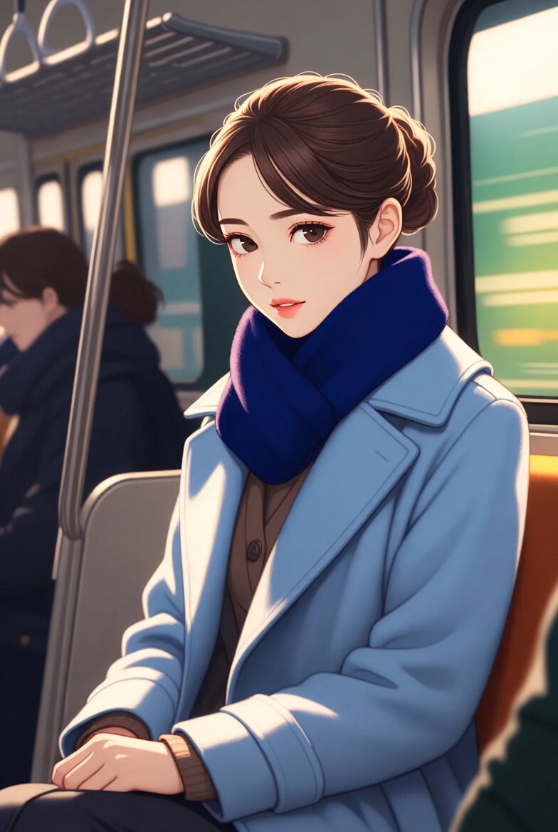 イラスト。日本人女性25歳。服装はビジネススーツにコートを着ている。マフラーをしている。コートの色はライトブルー。通勤電車の車内。
