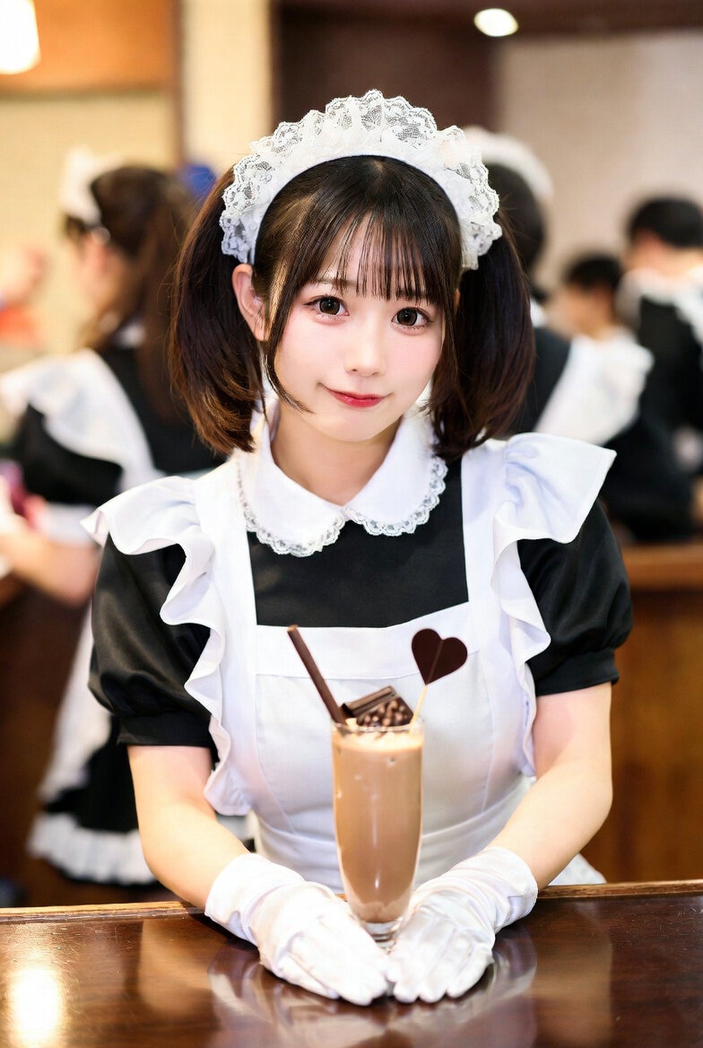 日本人女性20歳の写真。メイドバーに給仕するメイドさんの衣裳を着ている。バレンタインデーのイベントで、チョコレートのカクテルをつくってカウンターに出している。