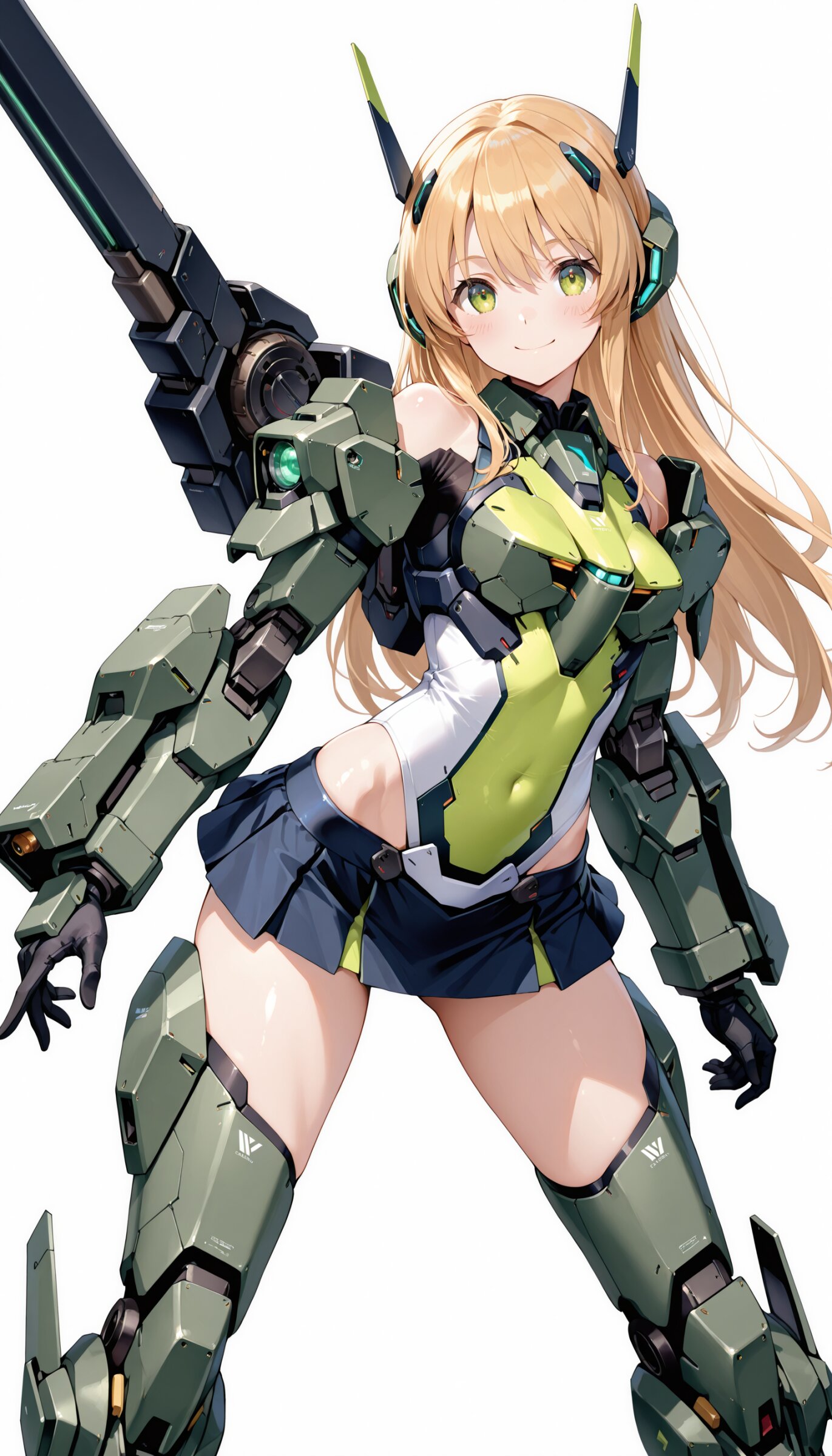 1girl, ((white background)), ultra detailed 8k cg render, masterpiece, high resolution, extremely detailed, mecha musume,mecha shoulder, mech leg, headgear, mecha armor, ((mini skirt)),long blonde hair, dropping green eyes, smile, dynamic posing,